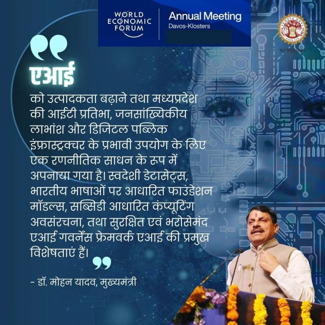 एआई को उत्पादकता बढ़ाने तथा मध्यप्रदेश की आईटी प्रतिभा, जनसांख्यिकीय लाभांश और डिजिटल पब्लिक इंफ्रास्ट्रक्चर के प्रभावी उपयोग के लिए एक रणनीतिक साधन के रूप में अपनाया गया है।