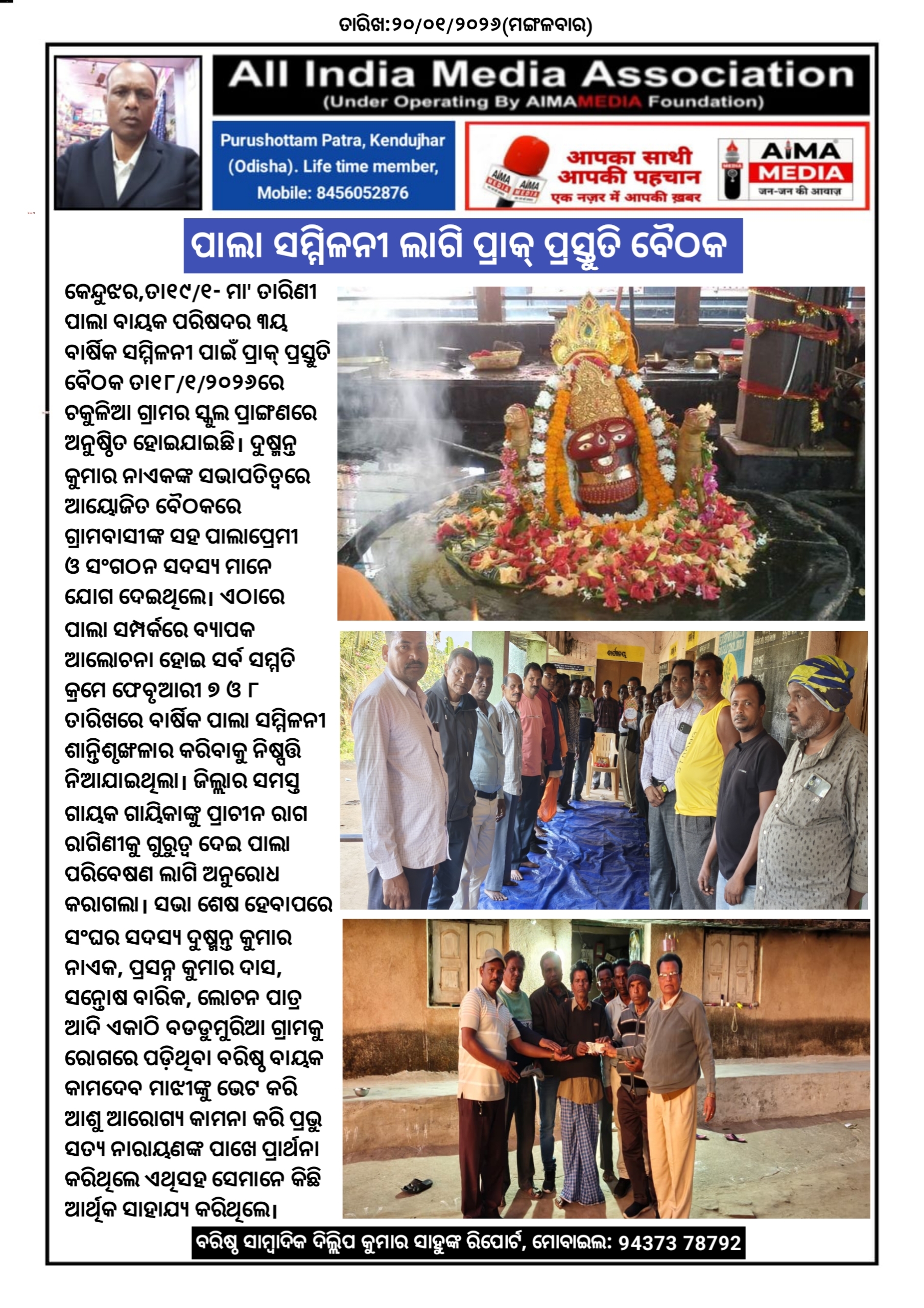 କେନ୍ଦୁଝର,ତା୧୯/୧- ମା' ତାରିଣୀ ପାଲା ବାୟକ ପରିଷଦର ୩ୟ ବାର୍ଷିକ ସମ୍ମିଳନୀ ପାଇଁ ପ୍ରାକ୍ ପ୍ରସ୍ତୁତି ବୈଠକ ତା୧୮/୧/୨୦୨୬ରେ ଚକୁଳିଆ ଗ୍ରାମର ସ୍କୁଲ ପ୍ରାଙ୍ଗଣରେ ଅନୁଷ୍ଠିତ ହୋଇଯାଇଛି। ଦୁଷ୍ମନ୍ତ କୁମାର ନାଏକଙ୍କ ସଭାପତିତ୍ୱରେ ଆୟୋଜିତ ବୈଠକରେ ଗ୍ରାମବାସୀଙ୍କ ସହ ପାଲାପ୍ରେମୀ ଓ ସଂଗଠନ ସଦସ୍ୟ ମାନେ ଯୋଗ ଦେଇଥିଲେ। ଏଠାରେ ପାଲା ସମ୍ପର୍କରେ ବ୍ୟାପକ ଆଲୋଚନା ହୋଇ ସର୍ବ ସମ୍ମତି କ୍ରମେ ଫେବୃଆରୀ ୭ ଓ ୮ ତାରିଖରେ ବାର୍ଷିକ ପାଲା ସମ୍ମିଳନୀ ଶାନ୍ତିଶୃଙ୍ଖଳାର କରିବାକୁ ନିଷ୍ପତ୍ତି ନିଆଯାଇଥିଲା । ଜିଲ୍ଲାର ସମସ୍ତ ଗାୟକ ଗାୟିକାଙ୍କୁ ପ୍ରାଚୀନ ରାଗ ରାଗିଣୀକୁ ଗୁରୁତ୍ୱ ଦେଇ ପାଲା ପରିବେଷଣ ଲାଗି ଅନୁରୋଧ କରାଗଲା। ସଭା ଶେଷ ହେବାପରେ ସଂଘର ସଦସ୍ୟ ଦୁଷ୍ମନ୍ତ କୁମାର ନାଏକ, ପ୍ରସନ୍ନ କୁମାର ଦାସ, ସନ୍ତୋଷ ବାରିକ, ଲୋଚନ ପାତ୍ର ଆଦି ଏକାଠି ବଡଡୁମୁରିଆ ଗ୍ରାମକୁ ରୋଗରେ ପଡ଼ିଥିବା ବରିଷ୍ଠ ବାୟକ କାମଦେବ ମାଝୀଙ୍କୁ ଭେଟ କରି ଆଶୁ ଆରୋଗ୍ୟ କାମନା କରି ପ୍ରଭୁ ସତ୍ୟ ନାରାୟଣଙ୍କ ପାଖେ ପ୍ରାର୍ଥନା କରିଥିଲେ ଏଥିସହ ସେମାନେ କିଛି ଆର୍ଥିକ ସାହାଯ୍ୟ କରିଥିଲେ।