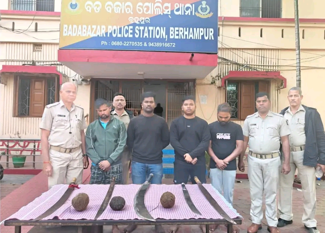 ବଡ଼ ବଜାର ଥାନା ପୋଲିସ ୪ ଜଣ ଅସାମାଜିକ ଯୁବକକୁ ଗିରଫ କରିଛି l ବିଳମ୍ୱିତ ରାତିରେ ପେଟ୍ରଲିଂ ବେଳେ ଧାନମେରା ସାହିର ୪ ଜଣକୁ ଗିରଫ କରିଛି l ଗିରଫ ଅଭିଯୁକ୍ତ ମାନେ ହେଲେ ଯୋଗେଶ କୁମାର ଗରୁଡ଼ ଔରଫ ମୁଣ୍ଡ,ଜିତେଶ ଦଳ ବେହେରା,ଗଣେଷ ନାୟକ,ମୁନା ସେଠୀ ହୋଇଥିବା ବେଳେ ଅଭିଯୁକ୍ତ ମାନଙ୍କ ଠାରୁ ପୋଲିସ ହାତ ତିଆରି ଜୀବନ୍ତ ବୋମା ତିନୋଟି ଏବଂ ପାଞ୍ଚଟି ବଡ ଆକାରର ଖଣ୍ଡା ଜବତ ହୋଇଛି ବୋଲି ସୂଚନା ଦେଇଛନ୍ତି ବ୍ରହ୍ମପୁର ଏସପି ସର୍ବଣା ବିବେକ ଏମ୍ l