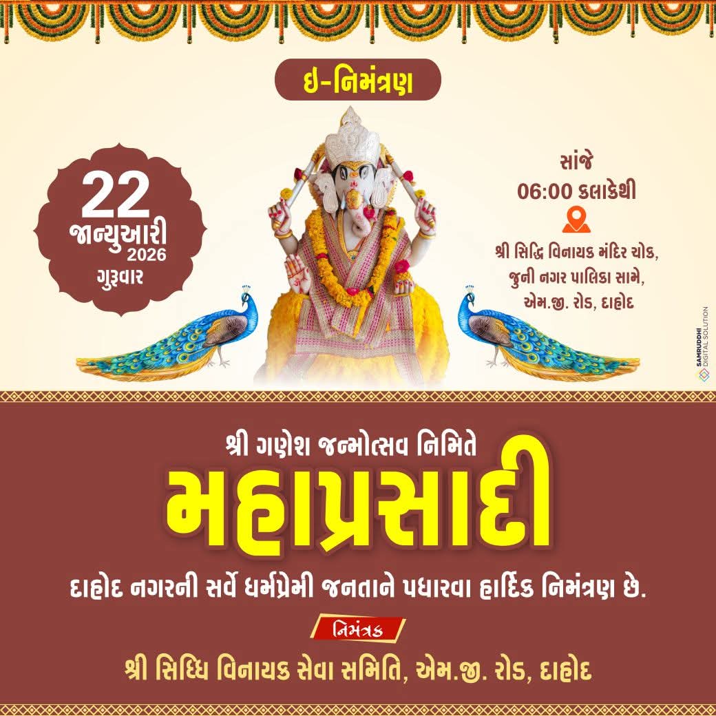 શ્રી સિદ્ધિ વિનાયક સેવા સમિતિ દાહોદ દરજી સમાજ ધ્યારા શ્રી ગણેશ જન્મોત્સવ ના નિમિતે મહાપ્રશાદી નુ આયોજન કરવા મા આવ્યું છે સૌને સહ પરિવાર પધારવા નિમંત્રણ છે