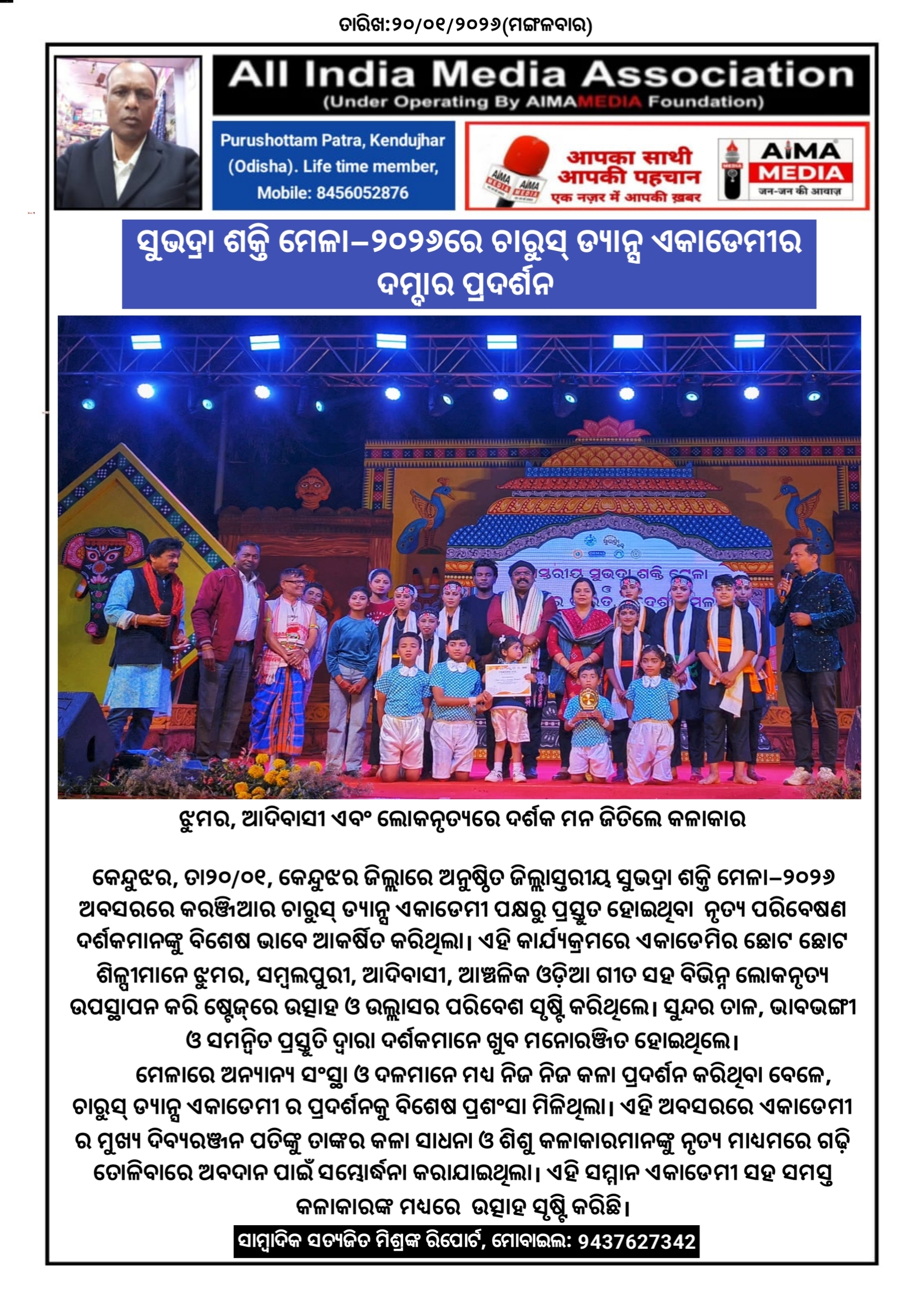 କେନ୍ଦୁଝର, ତା୨୦/୦୧, କେନ୍ଦୁଝର ଜିଲ୍ଲାରେ ଅନୁଷ୍ଠିତ ଜିଲ୍ଲାସ୍ତରୀୟ ସୁଭଦ୍ରା ଶକ୍ତି ମେଳା–୨୦୨୬ ଅବସରରେ କରଞ୍ଜିଆର ଚାରୁସ୍ ଡ୍ୟାନ୍ସ ଏକାଡେମୀ ପକ୍ଷରୁ ପ୍ରସ୍ତୁତ ହୋଇଥିବା ନୃତ୍ୟ ପରିବେଷଣ ଦର୍ଶକମାନଙ୍କୁ ବିଶେଷ ଭାବେ ଆକର୍ଷିତ କରିଥିଲା। ଏହି କାର୍ଯ୍ୟକ୍ରମରେ ଏକାଡେମିର ଛୋଟ ଛୋଟ ଶିଳ୍ପୀମାନେ ଝୁମର, ସମ୍ବଲପୁରୀ, ଆଦିବାସୀ, ଆଞ୍ଚଳିକ ଓଡ଼ିଆ ଗୀତ ସହ ବିଭିନ୍ନ ଲୋକନୃତ୍ୟ ଉପସ୍ଥାପନ କରି ଷ୍ଟେଜ୍‌ରେ ଉତ୍ସାହ ଓ ଉଲ୍ଲାସର ପରିବେଶ ସୃଷ୍ଟି କରିଥିଲେ। ସୁନ୍ଦର ତାଳ, ଭାବଭଙ୍ଗୀ ଓ ସମନ୍ୱିତ ପ୍ରସ୍ତୁତି ଦ୍ୱାରା ଦର୍ଶକମାନେ ଖୁବ ମନୋରଞ୍ଜିତ ହୋଇଥିଲେ।