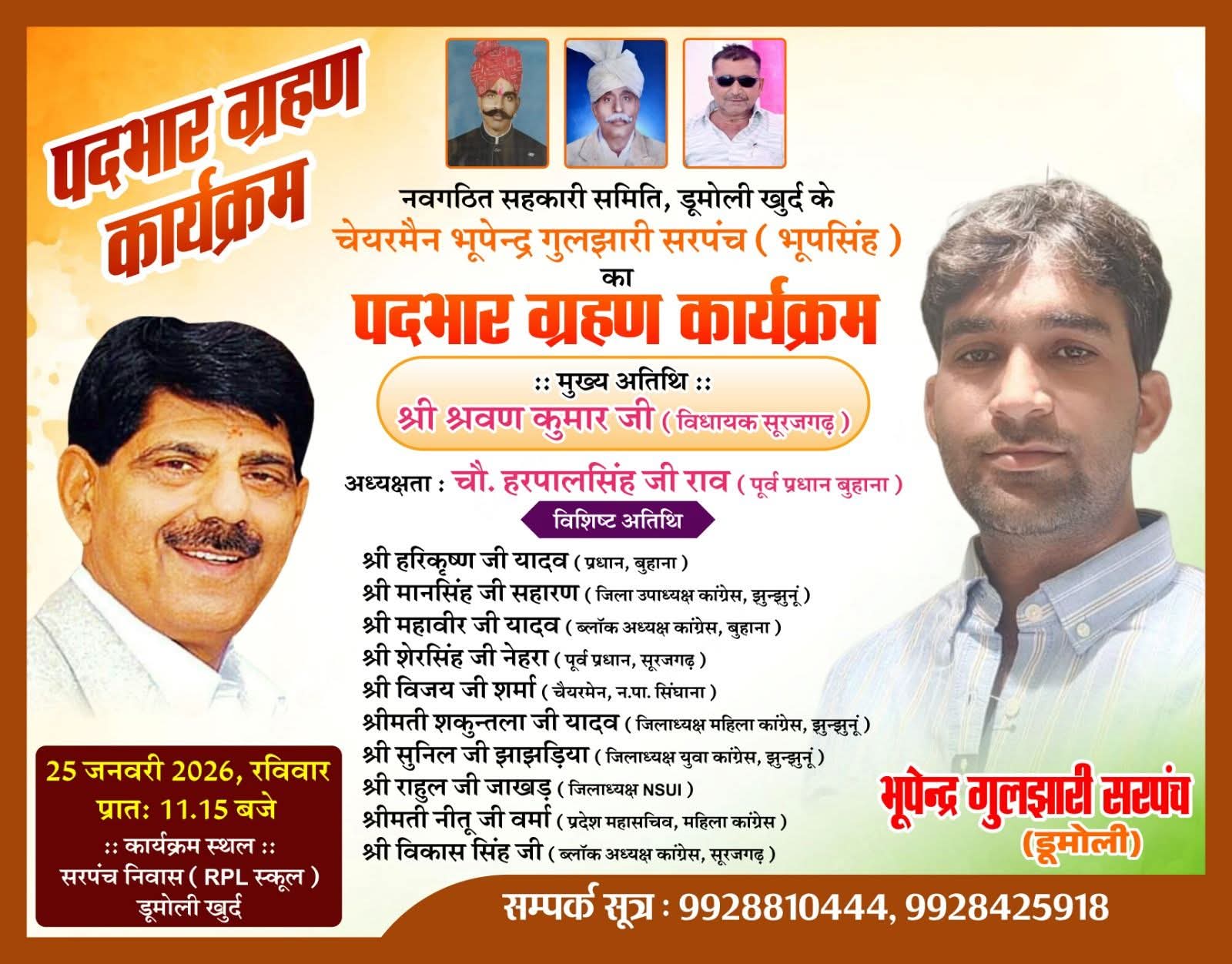 (सिंघाना) नवगठित सहकारी समिति डूमोली खुर्द के चेयरमैन भूपेन्द्र गुलझारी (भूपसिंह) का पदभार ग्रहण समारोह 25 जनवरी 2026 रविवार को प्रातः 11:15 बजे सरपंच निवास (आरपीएल स्कूल) डूमोली खुर्द में आयोजित किया जाएगा। कार्यक्रम में मुख्य अतिथि सूरजगढ़ विधायक श्रवण कुमार होंगे। जबकि कार्यक्रम की अध्यक्षता बुहाना के पूर्व प्रधान हरपाल सिंह करेंगे। विशिष्ट अतिथि बुहाना प्रधान हरीकृष्ण यादव, झुन्झुनू जिला कांग्रेस उपाध्यक्ष मानसिंह सहारण, ब्लाक कांग्रेस अध्यक्ष बुहाना महावीर प्रसाद यादव, पूर्व प्रधान सूरजगढ़ शेरसिंह नेहरा, सिंघाना चेयरमैन विजय शर्मा, महिला कांग्रेस जिलाध्यक्ष शकुन्तला यादव, युवा कांग्रेस जिलाध्यक्ष सुनिल झाझडिया,एनएसयूआई जिलाध्यक्ष राहुल जाखड़, महिला कांग्रेस प्रदेश महासचिव नीतु वर्मा, ब्लाक कांग्रेस अध्यक्ष सूरजगढ़ विकास सिंह सहित अनेक जनप्रतिनिधि व कार्यकर्ता मौजूद रहेंगे। पदभार ग्रहण कार्यक्रम को लेकर क्षेत्र में उत्साह का माहौल है। आयोजन समिति ने अधिक से अधिक लोगों से कार्यक्रम में पहुंचकर भूपेन्द्र सिंह को आशीर्वाद देने की अपील की है।