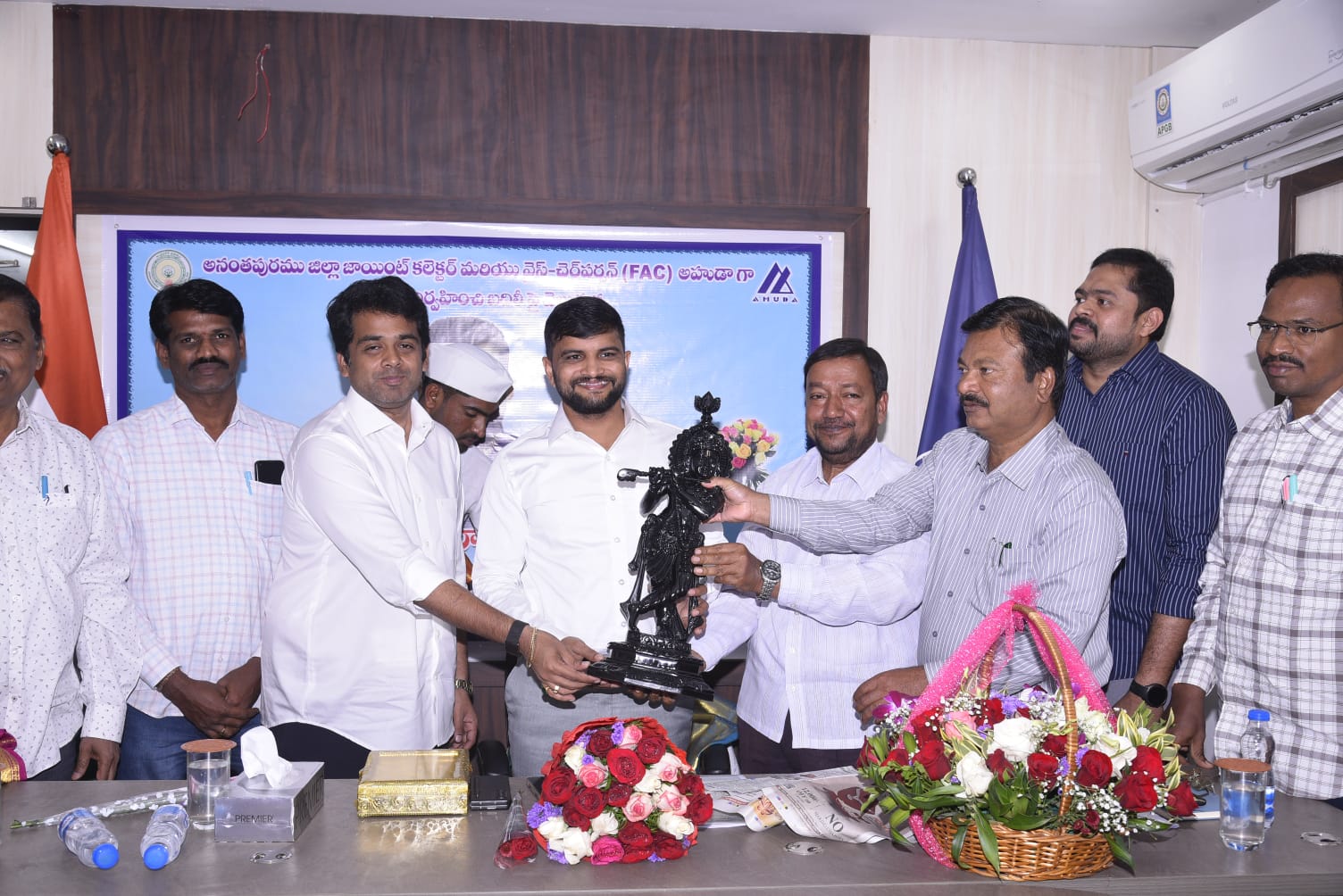 : అహుడ కార్యాలయంలో బదిలీపై వెళుతున్న ఇంఛార్జి జిల్లా కలెక్టర్ & అహుడ వైస్ చైర్మన్ శివ్ నారాయణ్ శర్మకి ఘన సన్మానంనగరంలోని అహుడ కార్యాలయంలో బదిలీపై వెళుతున్న ఇంఛార్జి జిల్లా కలెక్టర్ & అహుడ వైస్ చైర్మన్ శివ్ నారాయణ్ శర్మకి మంగళవారం ఘన సన్మాన కార్యక్రమం నిర్వహించారు. ఈ కార్యక్రమంలో అహుడ చైర్మన్ టి.సి.వరుణ్, అహుడ సెక్రటరీ రామకృష్ణారెడ్డి, అహుడ అధికారులు పాల్గొన్నారు.ఈ సందర్భంగా అహుడ చైర్మన్ టి.సి.వరుణ్ మాట్లాడుతూ ఇంఛార్జి జిల్లా కలెక్టర్ & అహుడ వైస్ చైర్మన్ శివ్ నారాయణ్ శర్మ బదిలీపై వెళ్లడం ఊహించలేదని, ఇంఛార్జి జిల్లా కలెక్టర్ నుంచి చాలా విషయాలు నేర్చుకున్నామని, ఆయన సేవలు మరువలేనివన్నారు. తాను చైర్మన్ గా బాధ్యతలు స్వీకరించిన నాటి నుంచి ఇంఛార్జి జిల్లా కలెక్టర్ తో కలిసిమెలిసి పనిచేయడం జరిగిందని, ఇది తాను జీవితాంతం గుర్తించుకునే విషయమన్నారు. ప్రజలకు సేవ చేయడంలో ఇంఛార్జి జిల్లా కలెక్టర్ & అహుడ వైస్ చైర్మన్ శివ్ నారాయణ్ శర్మ ముందు వరుసలో ఉంటారని, అహుడ అభివృద్ధికి ఆయన ఎంతగానో కృషి చేశారని, రాష్ట్రస్థాయిలో అహుడ ప్రధానంగా ఎదిగిందన్నారు. అహుడకి మంచి ల్యాండ్ బ్యాంక్ వచ్చేలా చర్యలు తీసుకున్నారని, ఆయన భవిష్యత్తులో మరిన్ని ఉన్నత శిఖరాలను అధిరోహించాలని ఆకాంక్షించారు.*