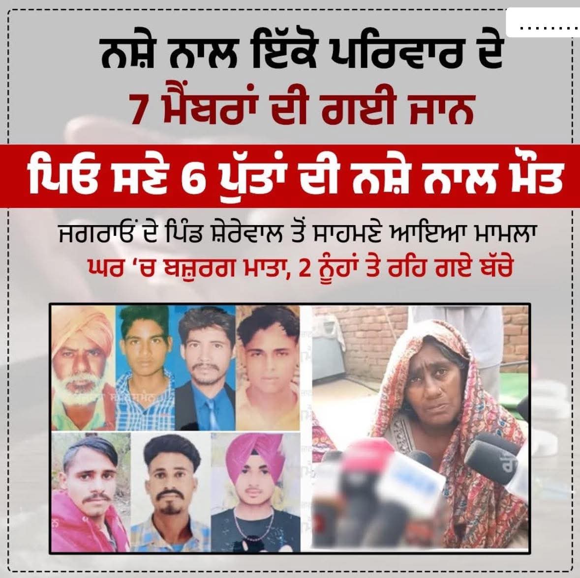ਪੰਜਾਬ ਜਗਰਾਓਂ ਤਹਿਸੀਲ ਨੇੜੇ ਸਿੱਧਵਾਂ ਬੇਟ ਏਰੀਏ ਵਿੱਚ ਪੈਂਦੇ ਪਿੰਡ ਸ਼ੇਰੇਵਾਲਾ ਇੱਕੋ ਪਰਿਵਾਰ ਦੇ 7 ਜੀਅ ਇੱਕ ਇੱਕ ਕਰਕੇ ਨਸ਼ੇ ਦੀ ਭੇਟ ਚੜ੍ਹੇ ਪੰਜਾਬ ਸਰਕਾਰ ਜਾ ਕਿਸੇ ਲੀਡਰ ਨੇ ਨਹੀ ਲਈ ਸਾਰ