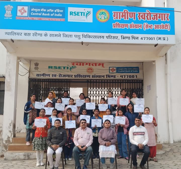 सेंट्रल बैंक ऑफ़ इंडिया ग्रामीण स्वरोजगार प्रशिक्षण संस्थान भिंड के द्वारा ब्यूटी पार्लर प्रशिक्षण का 35 दिवसीय कार्यक्रम का समापन किया गया। इस दौरान प्रशिक्षणार्थियों का मूल्यांकनकर्ता श्री रमन भदौरिया के द्वारा मूल्यांकन किया गया। इस अवसर पर निदेशक श्री संजीव श्रीवास्तव के द्वारा प्रशिक्षणार्थियों को स्वरोजगार के लिए चल रही शासन की विभिन्न योजनाओं के बारे में जानकारी प्रदान की और उनको प्रशिक्षण के पश्चात स्वरोजगार स्थापित करने के लिए प्रोत्साहित किया एवं प्रशिक्षार्थी को उज्ज्वल भविष्य की शुभकामनाएं दीं। प्रशिक्षार्थियों को प्रमाण-पत्र वितरित किए गए। इस अवसर पर ग्रामीण स्वरोजगार प्रशिक्षण संस्थान के संकाय श्री धीरेन्द्र श्रीवास्तव, संकाय सुश्री कीर्ति शर्मा, कार्यालय सहायक राहुल ओझा सहित समस्त स्टॉफ उपस्थित रहे।