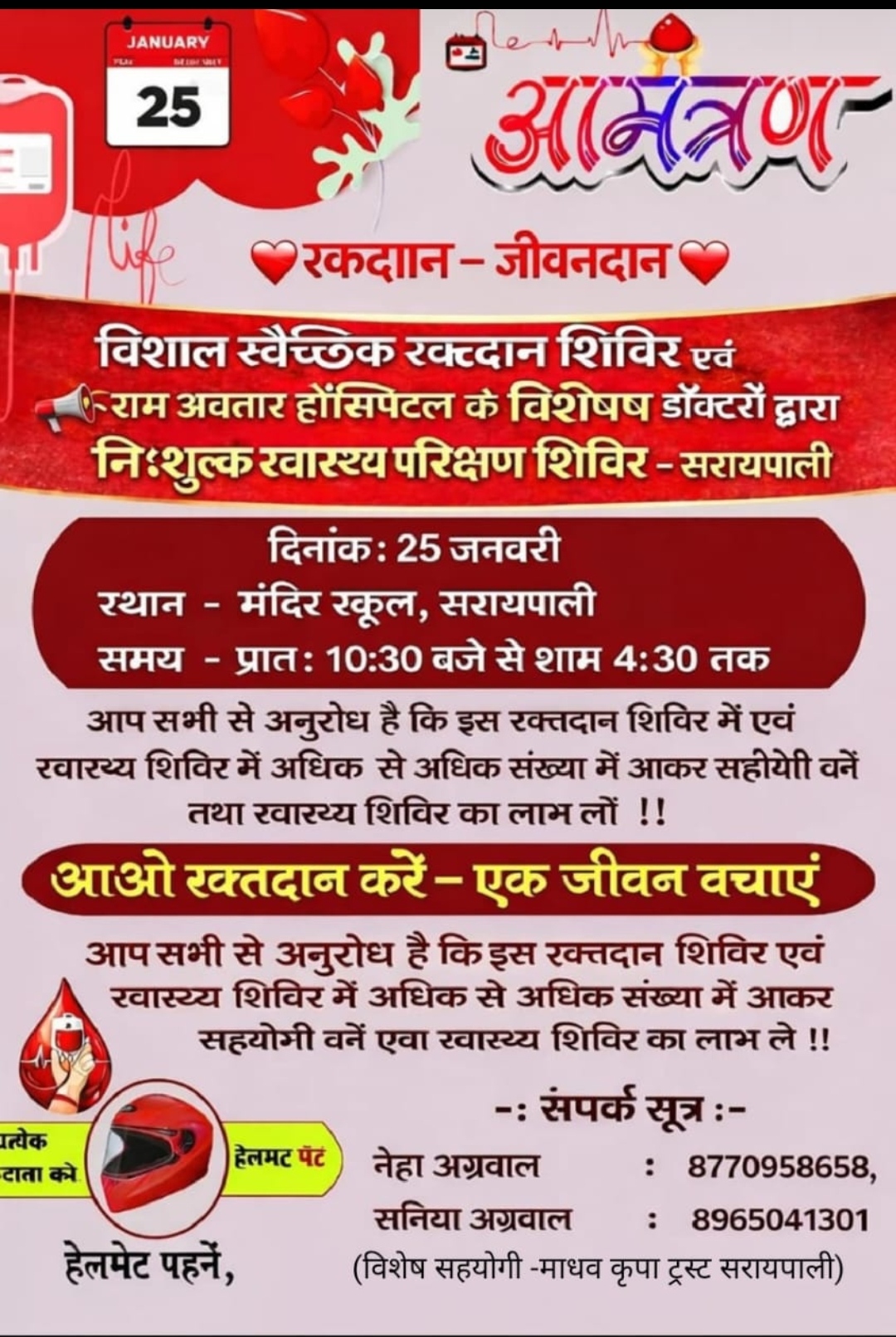 रक्तदान शिविर 25 जनवरी को सरायपाली मे
