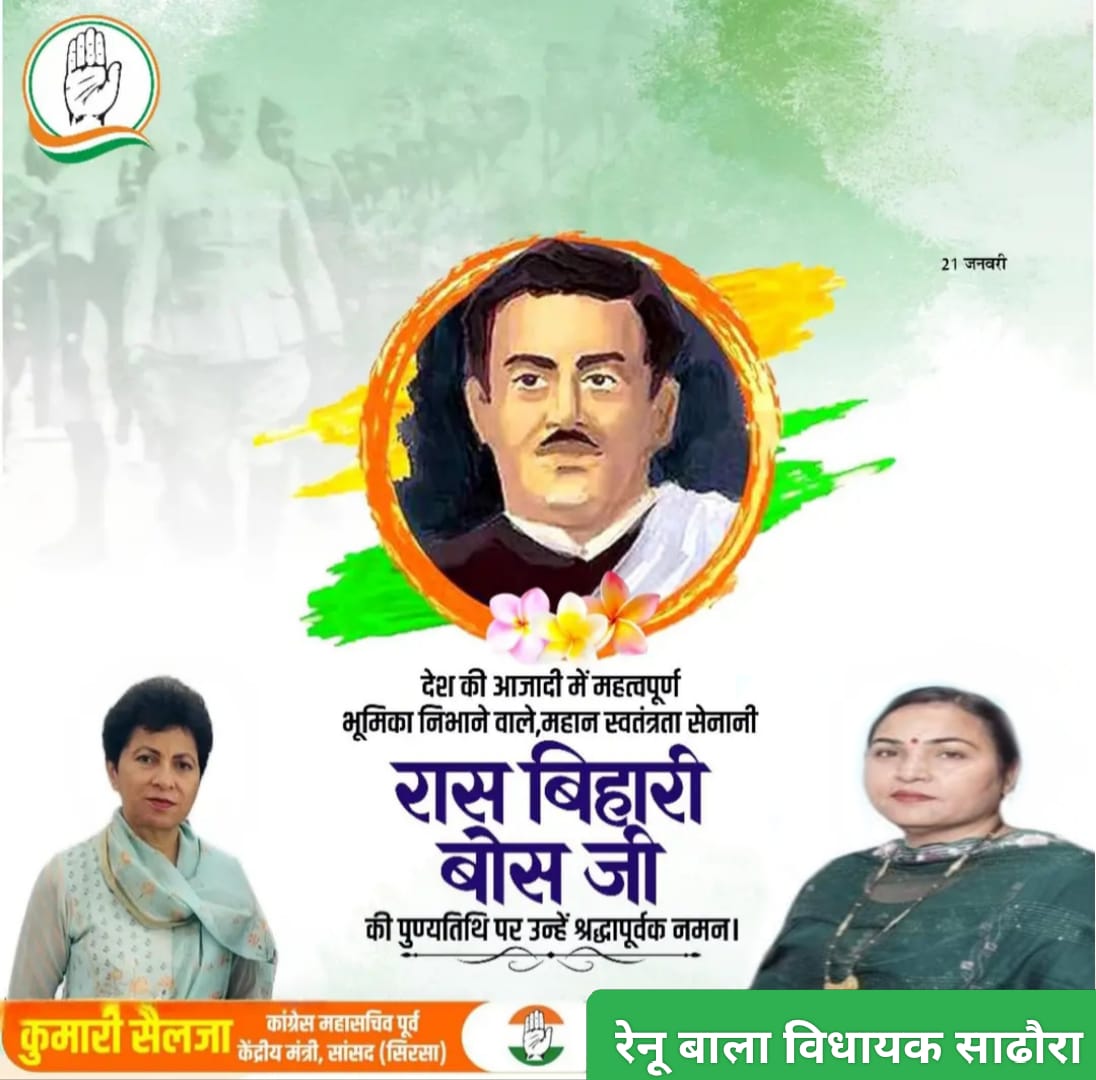 कपुरी :- हल्का सधौरा विधायक मैडम रेणु बाला जी नें महान स्वतंत्रता सेनानी रास बिहारी बोस जी की पुण्यतिथि पर श्रद्धांजलि दी, "देश के महान स्वतंत्रता सेनानी , अधिवक्ता ,शिक्षाविद् आजाद हिंद फौज के संगठन में महत्वपूर्ण भूमिका निभाने वाले राम बिहारी बोस जी की पुण्यतिथि पर उन्हें शत शत नमन ! भावभीनी श्रद्धांजलि "!