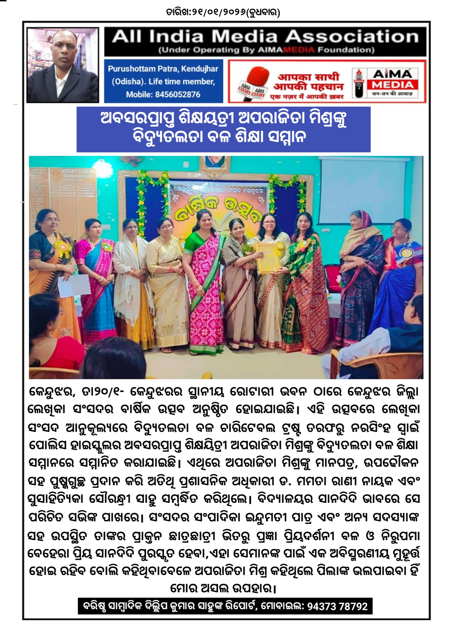 କେନ୍ଦୁଝର, ତା୨୦/୧- କେନ୍ଦୁଝରର ସ୍ଥାନୀୟ ରୋଟାରୀ ଭବନ ଠାରେ କେନ୍ଦୁଝର ଜିଲ୍ଲା ଲେଖିକା ସଂସଦର ବାର୍ଷିକ ଉତ୍ସବ ଅନୁଷ୍ଠିତ ହୋଇଯାଇଛି। ଏହି ଉତ୍ସବରେ ଲେଖିକା ସଂସଦ ଆନୁକୂଲ୍ୟରେ ବିଦ୍ୟୁତଲତା ବଳ ଚାରିଟେବଲ ଟ୍ରଷ୍ଟ ତରଫରୁ ନରସିଂହ ସ୍ୱାଇଁ ପୋଲିସ ହାଇସ୍କୁଲର ଅବସରପ୍ରାପ୍ତ ଶିକ୍ଷୟିତ୍ରୀ ଅପରାଜିତା ମିଶ୍ରଙ୍କୁ ବିଦ୍ୟୁତଲତା ବଳ ଶିକ୍ଷା ସମ୍ମାନରେ ସମ୍ମାନିତ କରାଯାଇଛି। ଏଥିରେ ଅପରାଜିତା ମିଶ୍ରଙ୍କୁ ମାନପତ୍ର, ଉପଢୌକନ ସହ ପୁଷ୍କଗୁଚ୍ଛ ପ୍ରଦାନ କରି ଅତିଥି ପ୍ରଶାସନିକ ଅଧିକାରୀ ଡ. ମମତା ରାଣୀ ନାୟକ ଏବଂ ସୁସାହିତ୍ୟିକା ସୌରନ୍ଧ୍ରୀ ସାହୁ ସମ୍ବର୍ଦ୍ଧିତ କରିଥିଲେ। ବିଦ୍ୟାଳୟର ସାନଦିଦି ଭାବରେ ସେ ପରିଚିତ ସଭିଙ୍କ ପାଖରେ। ସଂସଦର ସଂପାଦିକା ଇନ୍ଦୁମତୀ ପାତ୍ର ଏବଂ ଅନ୍ୟ ସଦସ୍ଯାଙ୍କ ସହ ଉପସ୍ଥିତ ତାଙ୍କର ପ୍ରାକ୍ତନ ଛାତ୍ରଛାତ୍ରୀ ଭିତରୁ ପ୍ରଜ୍ଞା ପ୍ରିୟଦର୍ଶନୀ ବଳ ଓ ନିରୁପମା ବେହେରା ପ୍ରିୟ ସାନଦିଦି ପୁରସ୍କୃତ ହେବା,ଏହା ସେମାନଙ୍କ ପାଇଁ ଏକ ଅବିସ୍ମରଣୀୟ ମୁହୂର୍ତ୍ତ ହୋଇ ରହିବ ବୋଲି କହିଥିବାବେଳେ ଅପରାଜିତା ମିଶ୍ର କହିଥିଲେ ପିଲାଙ୍କ ଭଲପାଇବା ହିଁ ମୋର ଅସଲ ଉପହାର।