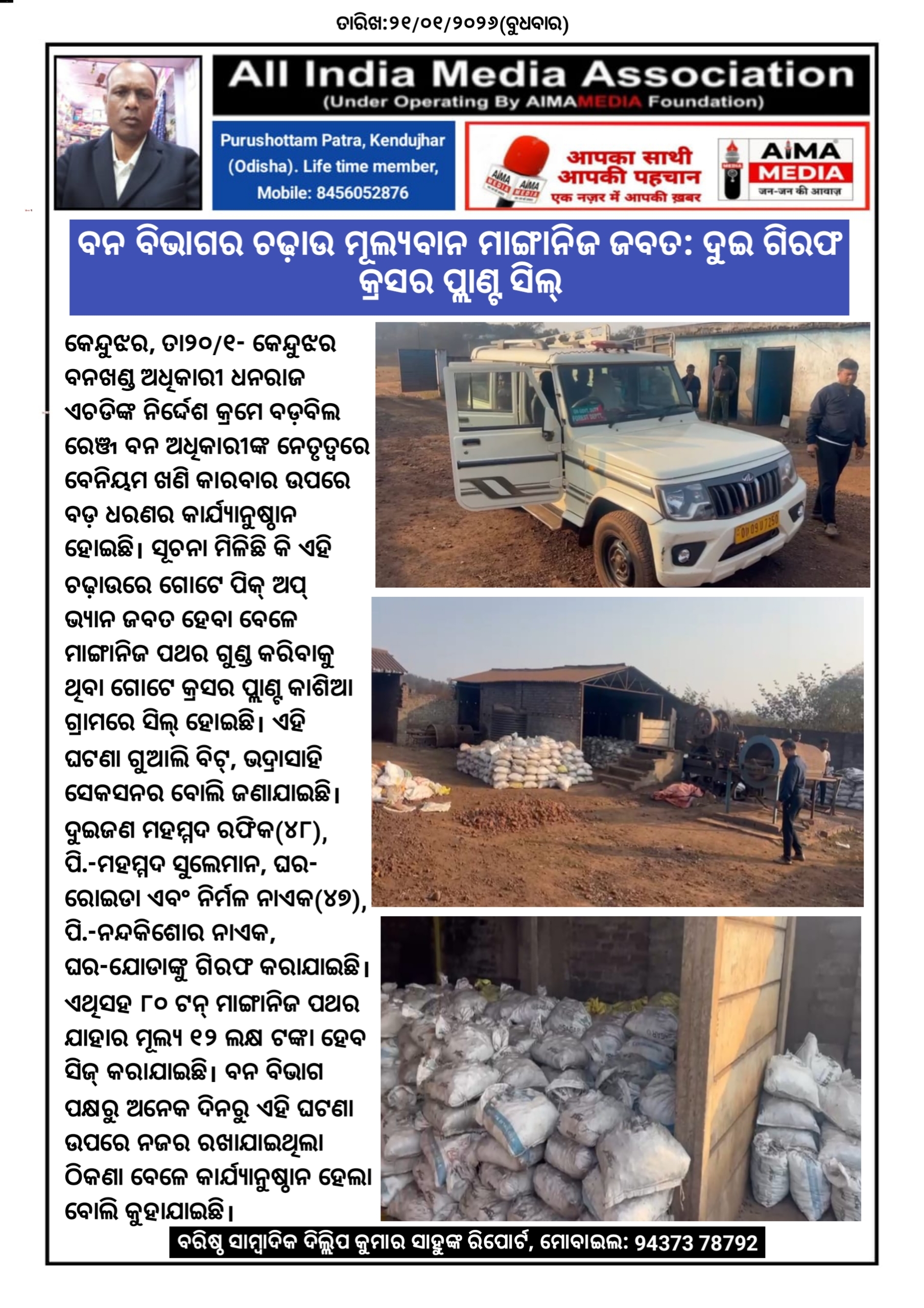କେନ୍ଦୁଝର,ତା୨୦/୧- କେନ୍ଦୁଝର ବନଖଣ୍ଡ ଅଧିକାରୀ ଧନରାଜ ଏଚଡିଙ୍କ ନିର୍ଦ୍ଦେଶ କ୍ରମେ ବଡ଼ବିଲ ରେଞ୍ଜ ବନ ଅଧିକାରୀଙ୍କ ନେତୃତ୍ୱରେ ବେନିୟମ ଖଣି କାରବାର ଉପରେ ବଡ଼ ଧରଣର କାର୍ଯ୍ୟାନୁଷ୍ଠାନ ହୋଇଛି। ସୂଚନା ମିଳିଛି କି ଏହି ଚଢ଼ାଉରେ ଗୋଟେ ପିକ୍ ଅପ୍ ଭ୍ୟାନ ଜବତ ହେବା ବେଳେ ମାଙ୍ଗାନିଜ ପଥର ଗୁଣ୍ଡ କରିବାକୁ ଥିବା ଗୋଟେ କ୍ରସର ପ୍ଲାଣ୍ଟ କାଶିଆ ଗ୍ରାମରେ ସିଲ୍ ହୋଇଛି। ଏହି ଘଟଣା ଗୁଆଲି ବିଟ୍, ଭଦ୍ରାସାହି ସେକସନର ବୋଲି ଜଣାଯାଇଛି। ଦୁଇଜଣ ମହମ୍ମଦ ରଫିକ(୪୮), ପି.-ମହମ୍ମଦ ସୁଲେମାନ, ଘର- ରୋଇଡା ଏବଂ ନିର୍ମଳ ନାଏକ(୪୭), ପି.-ନନ୍ଦକିଶୋର ନାଏକ, ଘର-ଯୋଡାଙ୍କୁ ଗିରଫ କରାଯାଇଛି। ଏଥିସହ ୮୦ ଟନ୍‌ ମାଙ୍ଗାନିଜ ପଥର ଯାହାର ମୂଲ୍ୟ ୧୨ ଲକ୍ଷ ଟଙ୍କା ହେବ ସିଜ୍‌ କରାଯାଇଛି। ବନ ବିଭାଗ ପକ୍ଷରୁ ଅନେକ ଦିନରୁ ଏହି ଘଟଣା ଉପରେ ନଜର ରଖାଯାଇଥିଲା ଠିକଣା ବେଳେ କାର୍ଯ୍ୟାନୁଷ୍ଠାନ ହେଲା ବୋଲି କୁହାଯାଇଛି।
