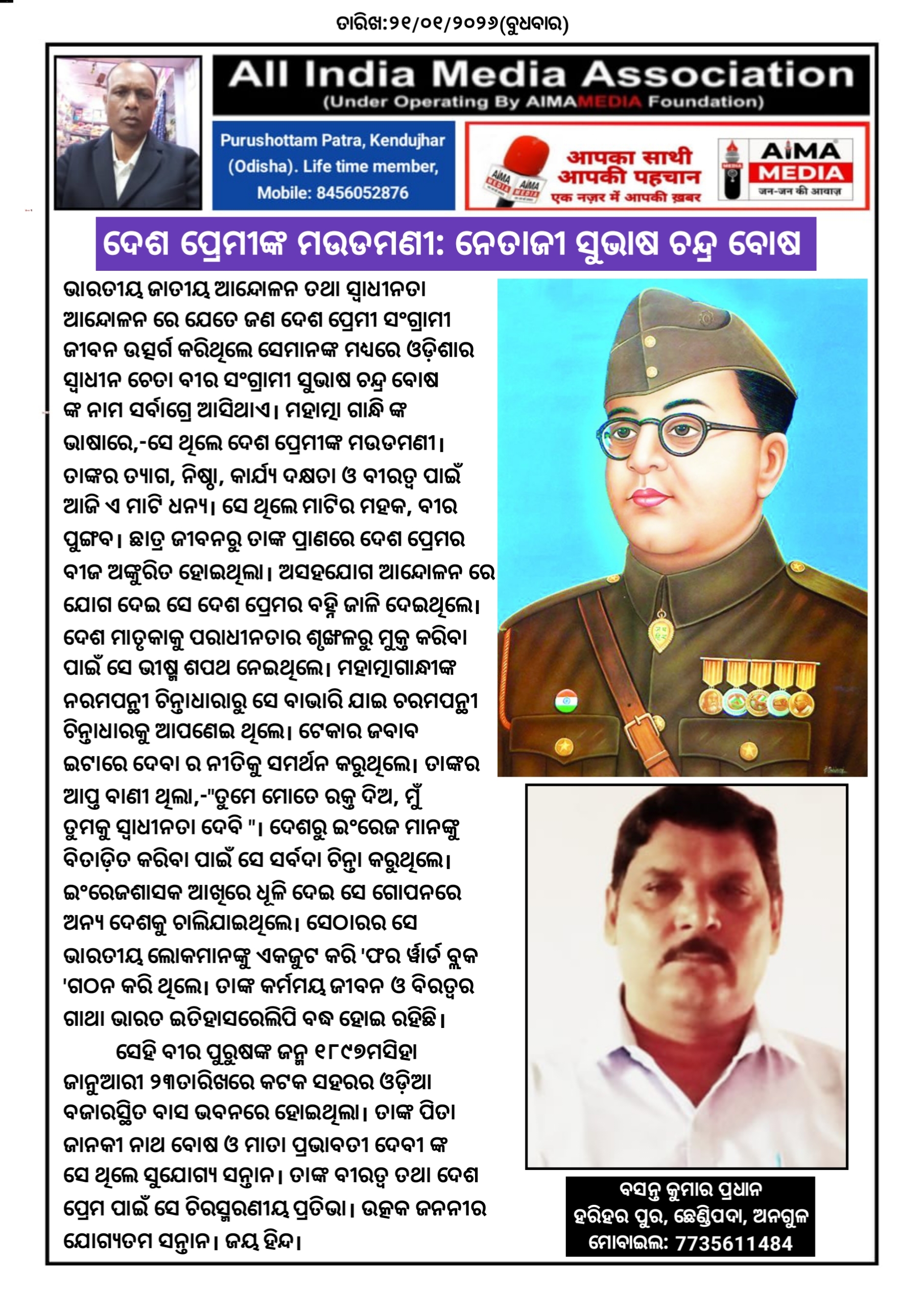 ଭାରତୀୟ ଜାତୀୟ ଆନ୍ଦୋଳନ ତଥା ସ୍ବାଧୀନତା ଆନ୍ଦୋଳନ ରେ ଯେତେ ଜଣ ଦେଶ ପ୍ରେମୀ ସଂଗ୍ରାମୀ ଜୀବନ ଉତ୍ସର୍ଗ କରିଥିଲେ ସେମାନଙ୍କ ମଧ୍ୟରେ ଓଡ଼ିଶାର ସ୍ବାଧୀନ ଚେତା ବୀର ସଂଗ୍ରାମୀ ସୁଭାଷ ଚନ୍ଦ୍ର ବୋଷ ଙ୍କ ନାମ ସର୍ବାଗ୍ରେ ଆସିଥାଏ l ମହାତ୍ମା ଗାନ୍ଧି ଙ୍କ ଭାଷାରେ,-ସେ ଥିଲେ ଦେଶ ପ୍ରେମୀଙ୍କ ମଉଡମଣୀ l ତାଙ୍କର ତ୍ୟାଗ, ନିଷ୍ଠା, କାର୍ଯ୍ୟ ଦକ୍ଷତା ଓ ବୀରତ୍ୱ ପାଇଁ ଆଜି ଏ ମାଟି ଧନ୍ୟ l ସେ ଥିଲେ ମାଟିର ମହକ, ବୀର ପୁଙ୍ଗବ l ଛାତ୍ର ଜୀବନରୁ ତାଙ୍କ ପ୍ରାଣରେ ଦେଶ ପ୍ରେମର ବୀଜ ଅଙ୍କୁରିତ ହୋଇଥିଲା l ଅସହଯୋଗ ଆନ୍ଦୋଳନ ରେ ଯୋଗ ଦେଇ ସେ ଦେଶ ପ୍ରେମର ବହ୍ନି ଜାଳି ଦେଇଥିଲେ l ଦେଶ ମାତୃକାକୁ ପରାଧୀନତାର ଶୃଙ୍ଖଳରୁ ମୁକ୍ତ କରିବା ପାଇଁ ସେ ଭୀଷ୍ମ ଶପଥ ନେଇଥିଲେ l ମହାତ୍ମାଗାନ୍ଧୀଙ୍କ ନରମପନ୍ଥୀ ଚିନ୍ତାଧାରାରୁ ସେ ବାଭାରି ଯାଇ ଚରମପନ୍ଥୀ ଚିନ୍ତାଧାରକୁ ଆପଣେଇ ଥିଲେ l ଟେକାର ଜବାବ ଇଟାରେ ଦେବା ର ନୀତିକୁ ସମର୍ଥନ କରୁଥିଲେ l ତାଙ୍କର ଆପ୍ତ ବାଣୀ ଥିଲା,-"ତୁମେ ମୋତେ ରକ୍ତ ଦିଅ, ମୁଁ ତୁମକୁ ସ୍ବାଧୀନତା ଦେବି "l ଦେଶରୁ ଇଂରେଜ ମାନଙ୍କୁ ବିତାଡ଼ିତ କରିବା ପାଇଁ ସେ ସର୍ବଦା ଚିନ୍ତା କରୁଥିଲେ l ଇଂରେଜଶାସକ ଆଖିରେ ଧୂଳି ଦେଇ ସେ ଗୋପନରେ ଅନ୍ୟ ଦେଶକୁ ଚାଲିଯାଇଥିଲେ l ସେଠାରର ସେ ଭାରତୀୟ ଲୋକମାନଙ୍କୁ ଏକଜୁଟ କରି 'ଫର ର୍ୱାର୍ଡ ବ୍ଲକ 'ଗଠନ କରି ଥିଲେ l ତାଙ୍କ କର୍ମମୟ ଜୀବନ ଓ ବିରତ୍ୱର ଗାଥା ଭାରତ ଇତିହାସରେଲିପି ବଦ୍ଧ ହୋଇ ରହିଛି l