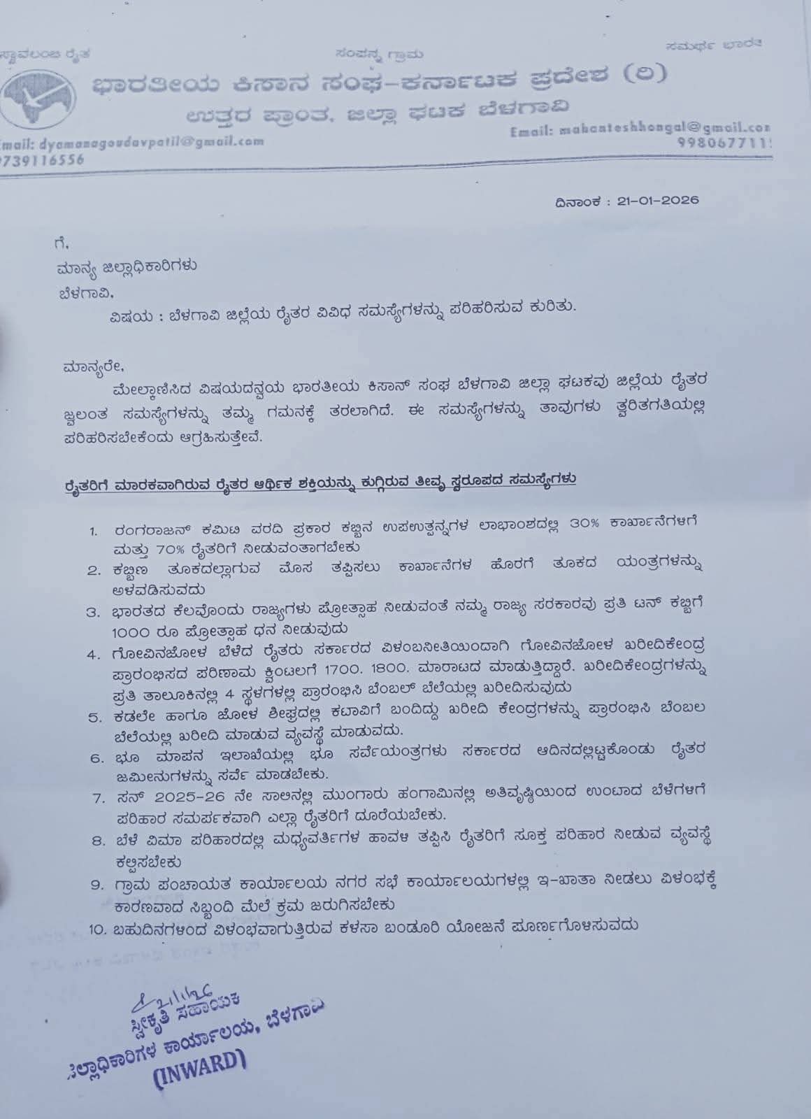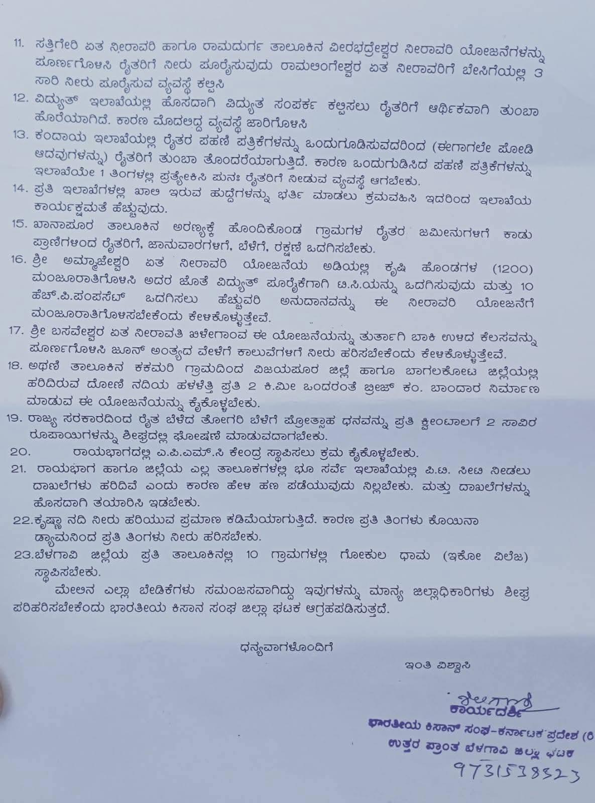 ಭಾರತೀಯ ಕಿಸಾನ ಸಂಘ-ಕರ್ನಾಟಕ ಪ್ರದೇಶ (ರಿ) ಉತ್ತರ ಪ್ರಾಂತ, ಜಿಲ್ಲಾ ಘಟಕ ಬೆಳಗಾವಿ ಮಾನ್ಯ ಜಿಲ್ಲಾಧಿಕಾರಿಗಳು ಬೆಳಗಾವಿ. ವಿಷಯ : ಬೆಳಗಾವಿ ಜಿಲ್ಲೆಯ ರೈತರ ವಿವಿಧ ಸಮಸ್ಯೆಗಳನ್ನ