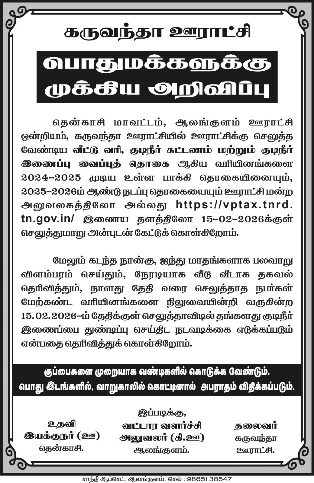 2025 - 2026 ஆம் ஆண்டு நடப்பு தொகையும் ஊராட்சி மன்ற அலுவலகத்திலோ அல்லது இணையதளத்திலோ 15 பிப்ரவரி 2026க்குள் செலுத்துமாறு அன்புடன் கேட்டுக் கொள்வதாக கருவந்தா ஊராட்சி மன்ற தலைவர் அறிவித்துள்ளார்.