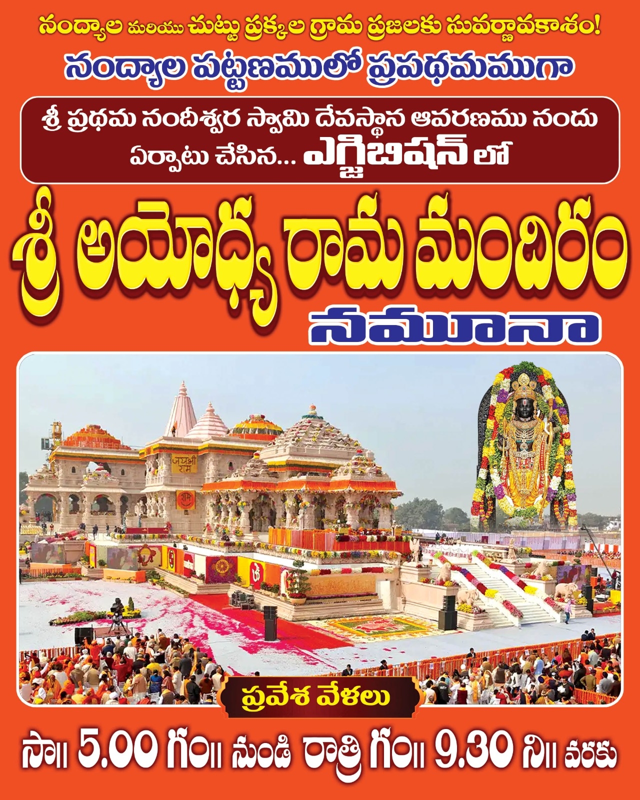 నంద్యాల (ప్రజా పక్షం): నంద్యాల మరియు చుట్టుప్రక్కల గ్రామ ప్రజలకు అపూర్వమైన దైవ దర్శనావకాశం లభించింది. నంద్యాల పట్టణంలో తొలిసారిగా శ్రీ ప్రథమ నందీశ్వర స్వామి దేవస్థాన ఆవరణంలో ఏర్పాటు చేసిన ప్రత్యేక ఎగ్జిబిషన్‌లో శ్రీ అయోధ్య రామ మందిరం అద్భుత నమూనాను భక్తుల దర్శనార్థం ఉంచారు.భారతదేశ ఆధ్యాత్మిక వైభవానికి ప్రతీకగా నిలిచిన అయోధ్య శ్రీ రామ మందిరాన్ని అచ్చుగుద్దినట్టుగా ప్రతిబింబించే ఈ నమూనా భక్తులను విశేషంగా ఆకట్టుకుంటోంది. అత్యంత నిశితంగా నిర్మించిన ఈ నమూనా ద్వారా అయోధ్య రామ మందిర వైభవాన్ని నంద్యాలలోనే వీక్షించే అరుదైన అవకాశం లభిస్తోంది.ఈ ఎగ్జిబిషన్‌కు సాయంత్రం ఐదు గంటల నుంచి రాత్రి తొమ్మిది గంటల ముప్పై నిమిషాల వరకు ప్రవేశం కల్పిస్తున్నట్లు నిర్వాహకులు శీను తెలిపారు. భక్తులకు ఎలాంటి అసౌకర్యం కలగకుండా ఉచిత పార్కింగ్ సౌకర్యాన్ని ఏర్పాటు చేసినట్లు నిర్వాహకులు శ్రీనివాస చౌదరి వెల్లడించారు.దైవ భక్తి, సంస్కృతి, సంప్రదాయాల సమ్మేళనంగా రూపొందించిన ఈ అయోధ్య రామ మందిర నమూనా ప్రదర్శనను ప్రతి ఒక్కరూ వీక్షించి దైవానుగ్రహం పొందాలని నిర్వాహకులు కోరుతున్నారు.