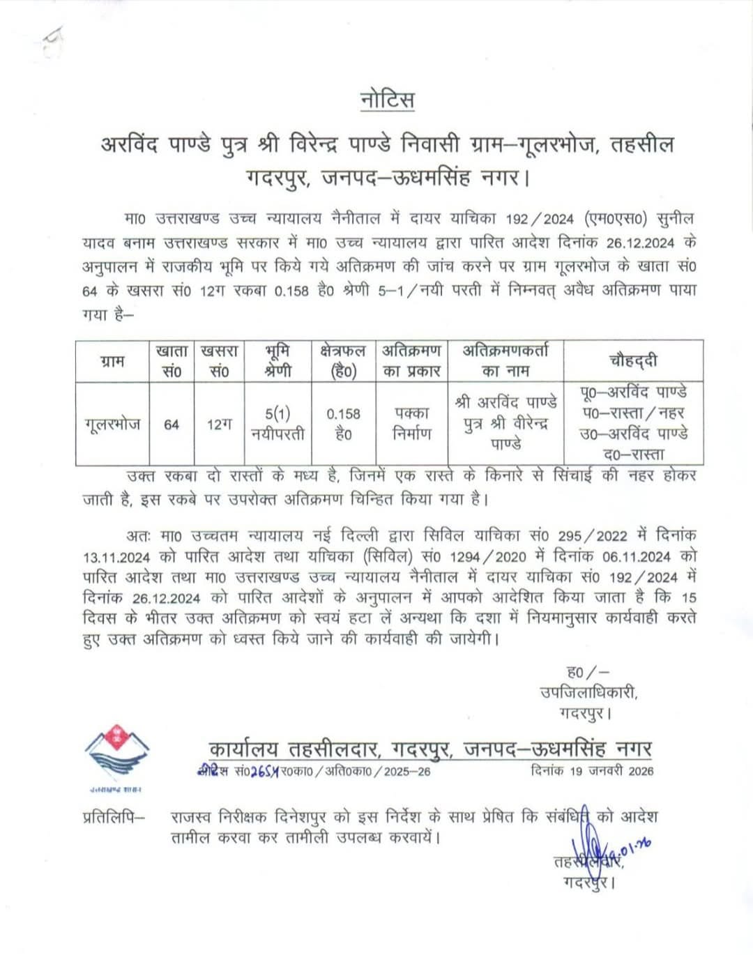 पूर्व कैबिनेट मंत्री एवं गदरपुर विधायक अरविंद पांडेय के आवास परिसर से अवैध अतिक्रमण हटाने को लेकर तहसील प्रशासन ने कार्रवाई शुरू कर दी है। मंगलवार शाम गदरपुर तहसील के कानूनगो भगत सिंह, पटवारी सुरजीत सिंह, हरजीत, जितेंद्र सिंह और सरताज अली विधायक के आवास पर पहुंचे। विधायक की अनुपस्थिति में प्रशासनिक टीम ने उनके पुत्र अतुल पांडेय को आवास परिसर में बने कैंप कार्यालय से संबंधित 0.158 हेक्टेयर भूमि पर किए गए कथित अवैध अतिक्रमण को हटाने का नोटिस सौंपा।