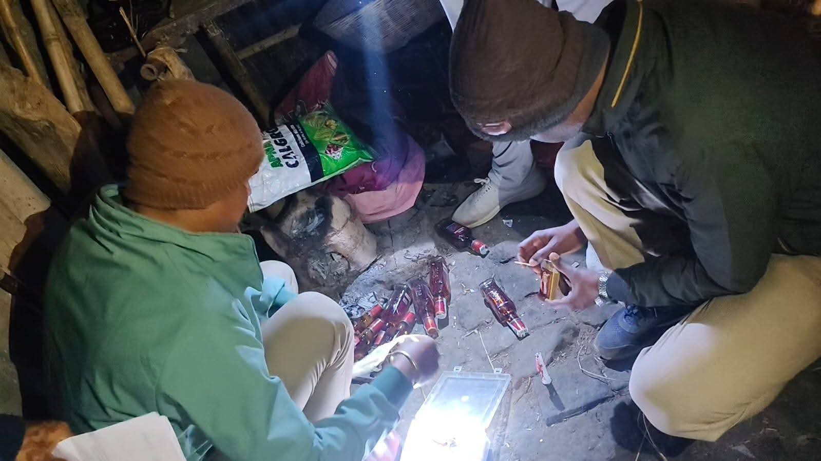 पुलिस को देखते ही युवक घर से भागने लगे। पुलिस जवानों ने तत्परता दिखाते हुए उनका पीछा किया और उन्हें पकड़ लिया। तलाशी के दौरान उनके घर से एक झोले में कुल 1.440 लीटर अंग्रेजी शराब बरामद हुई।
