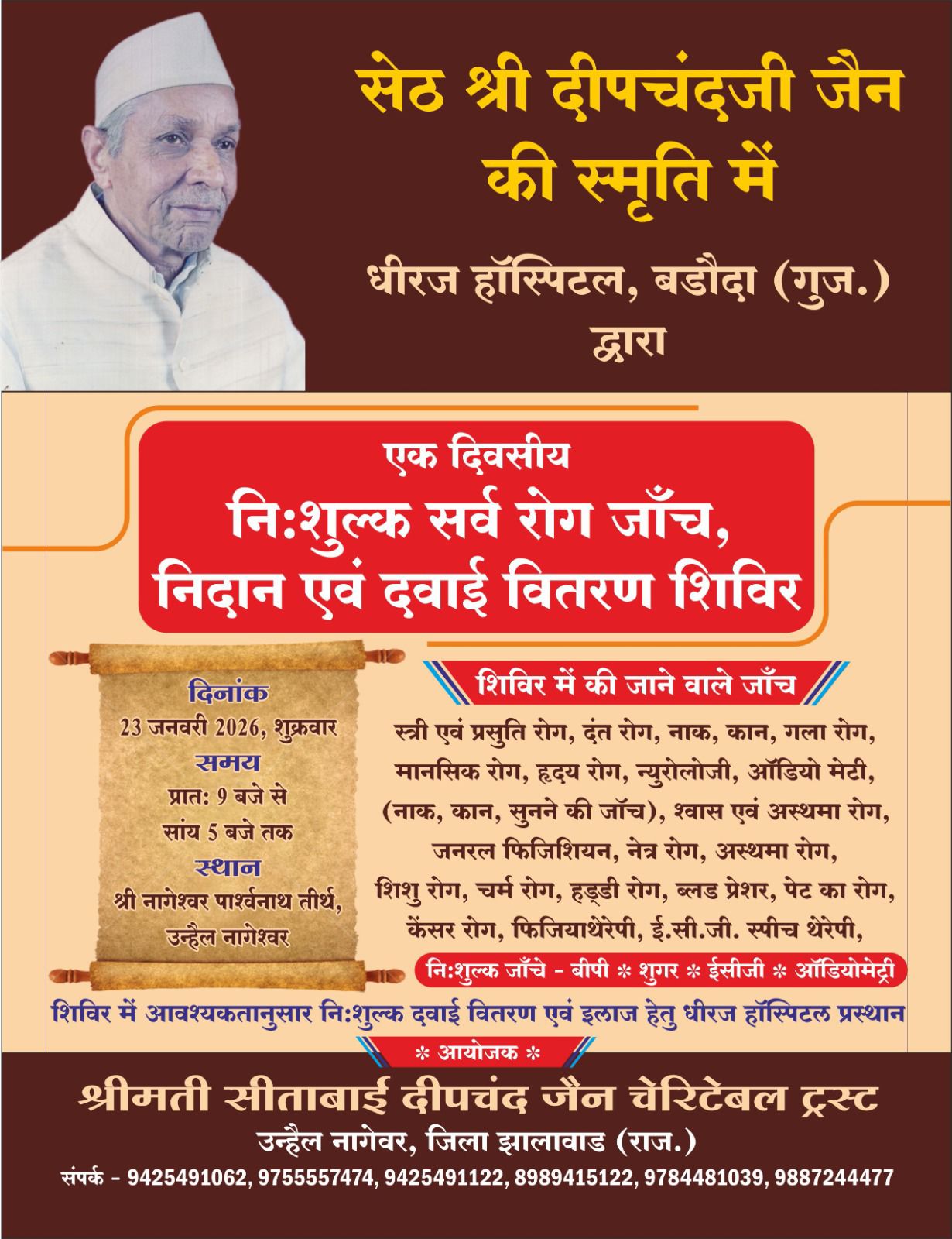 स्व. सेठ दीपचंदजी जैन की स्मृति में धीरज हॉस्पिटल, बड़ौदा एवं श्रीमती सीताबाई दीपचंद जैन चैरिटेबल ट्रस्ट द्वारा एक दिवसीय निःशुल्क सर्व रोग जाँच एवं दवा वितरण शिविर का आयोजन किया जा रहा है।