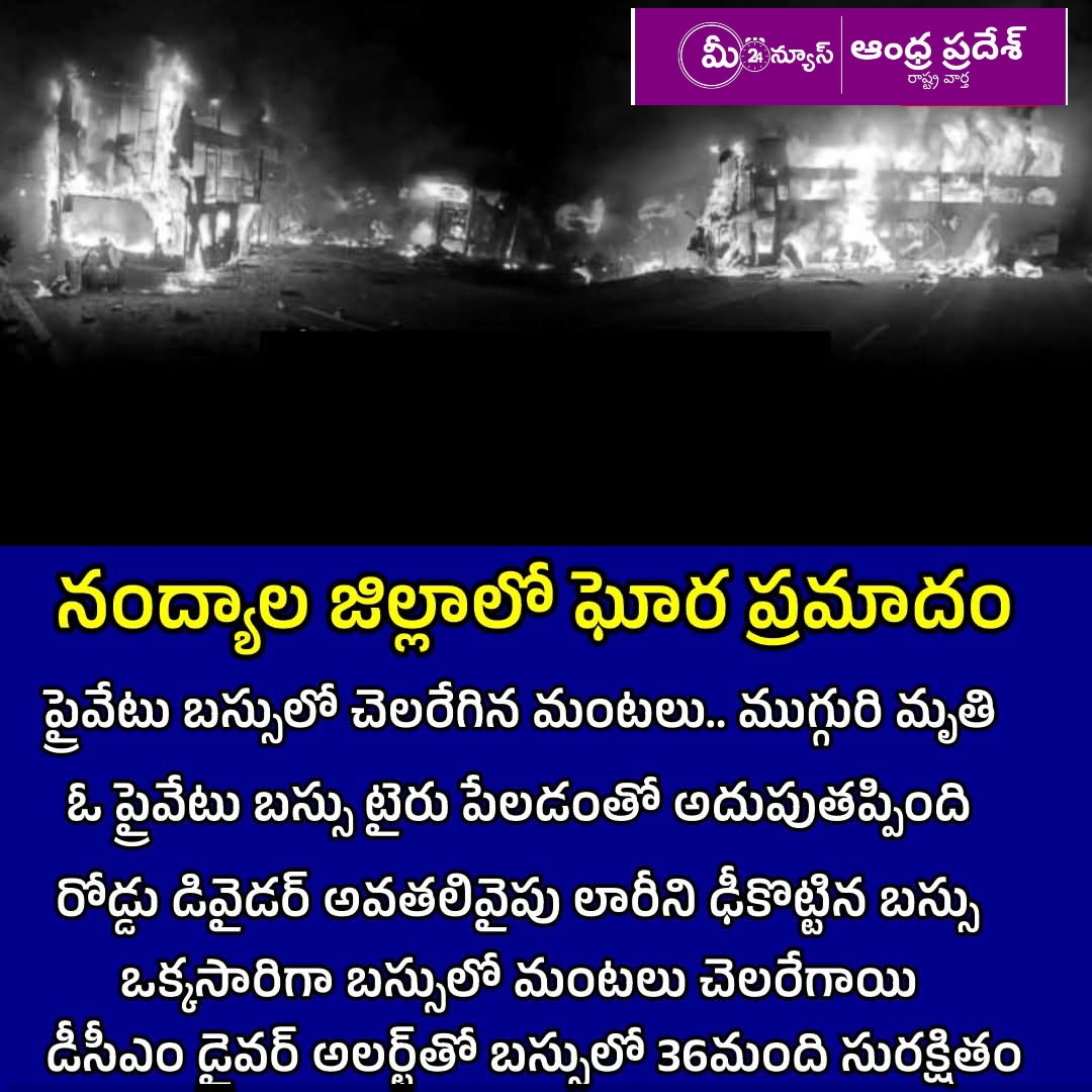 ప్రైవేటు బస్సులో చెలరేగిన మంటలు.. ముగ్గురి మృతి ఓ ప్రైవేటు బస్సు టైరు పేలడంతో అదుపుతప్పింది రోడ్డు డివైడర్ అవతలివైపు లారీని ఢీకొట్టిన బస్సు ఒక్కసారిగా బస్సులో మంటలు చెలరేగాయి డీసీఎం డైవర్ అలర్ట్ బస్సులో 36మంది సురక్షితం నంద్యాల జిల్లాలో జరిగిన ఈ ప్రమాద వార్త నిజంగా దిగ్భ్రాంతికరం. ప్రాణనష్టం జరగడం చాలా బాధాకరం, అయితే ఆ డీసీఎం డ్రైవర్ సమయస్ఫూర్తితో వ్యవహరించడం వల్ల ఒక పెద్ద ప్రాణాపాయం తప్పిందని చెప్పాలి.
