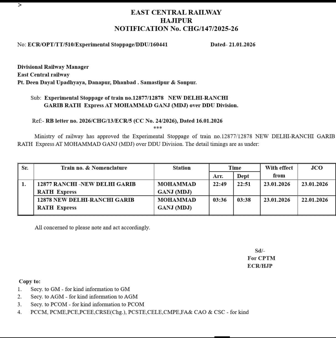 *राँची नई दिल्ली गरीब रथ एक्सप्रेस (ट्रेन संख्या 12877/12878) का मोहम्मदगंज रेलवे स्टेशन पर कल से ठहराव हेतु रेलवे द्वारा अधिसूचना हुयी जारी..*