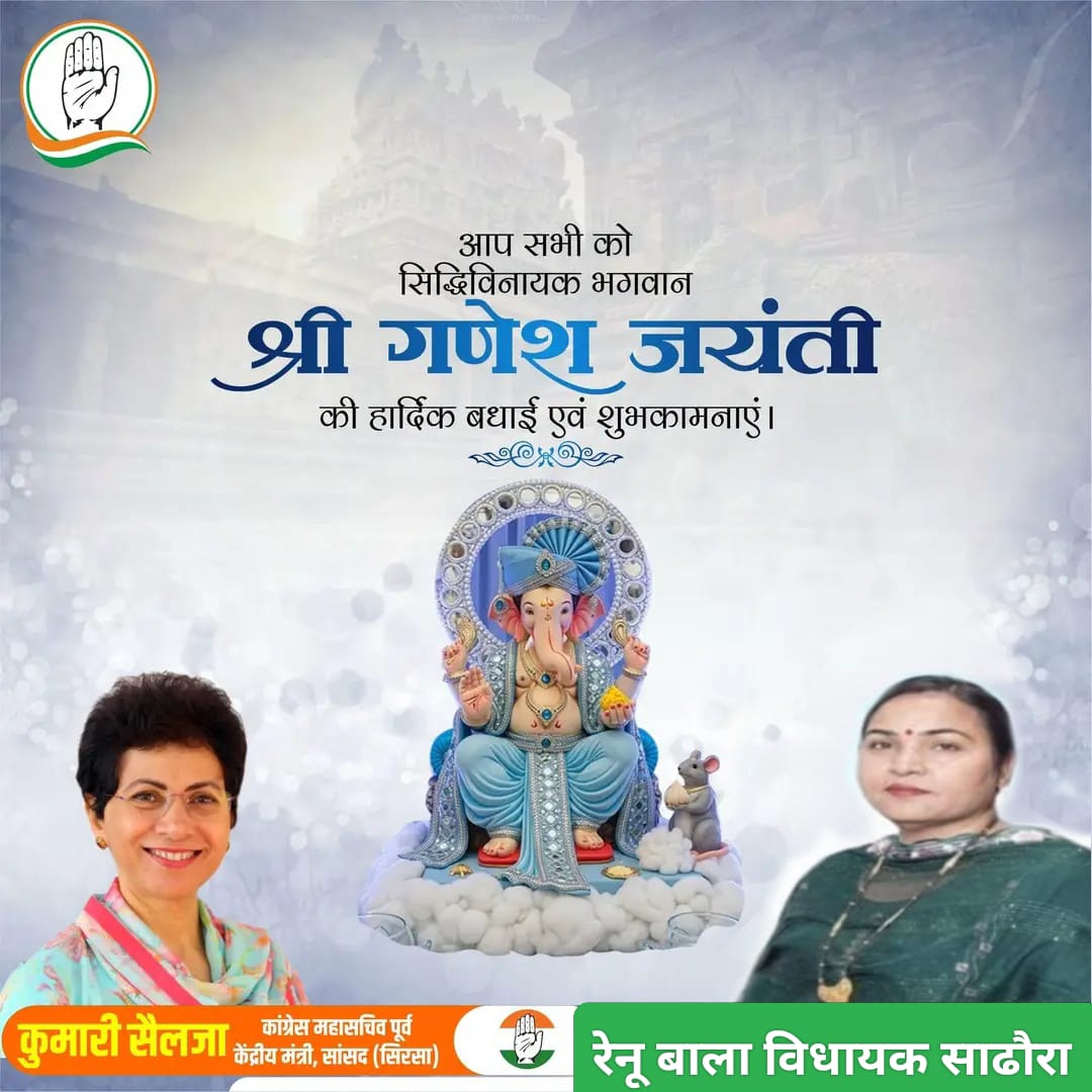 कपुरी :- हल्का सधौरा विधायक मैडम रेणु बाला जी नें भगवान श्री गणेश जी की जयंती पर दी शुभकामनायें, "विघ्नों को हरने वाले, बुद्धि और विवेक के दाता भगवान श्री गणेश जी की जयंती पर सभी देशवासियों को हार्दिक शुभकामनाएँ।