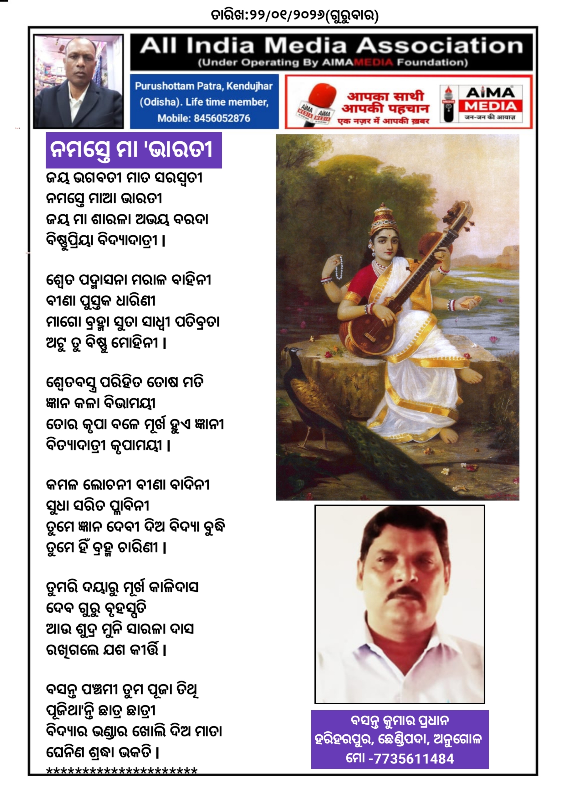 ନମସ୍ତେ ମା 'ଭାରତୀ - ବସନ୍ତ କୁମାର ପ୍ରଧାନ ଙ୍କ ଦ୍ଵାରା ରଚିତ କବିତା।