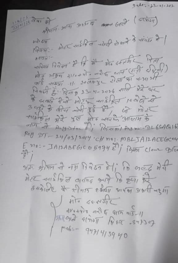 पीड़ित ने अपने आवेदन में बताया है कि दिनांक 23 जनवरी 2026 की रात्रि अज्ञात चोरों ने उनके घर के दरवाजे से मोटरसाइकिल चोरी कर ली। घटना के बाद काफी खोजबीन की गई, लेकिन जब मोटरसाइकिल का कोई सुराग नहीं मिला, तब मजबूर होकर थाना में लिखित शिकायत दर्ज कराई गई।