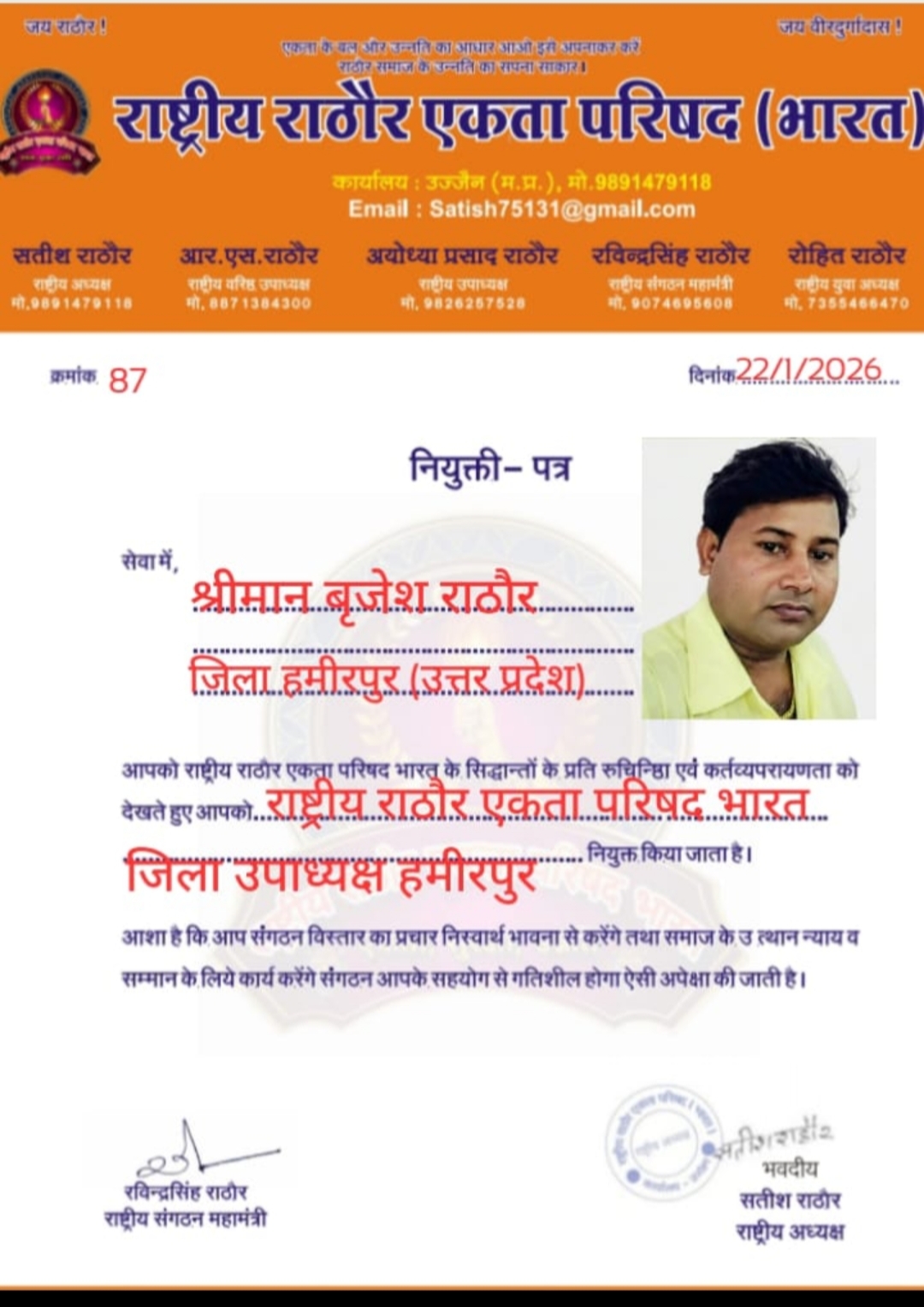 📢📢📢📢📢 *आदरणीय श्री बृजेश जी राष्ट्रीय राठौर एकता परिषद भारत* में "*जिला उपाध्यक्ष" हमीरपुर उ०प्र०*