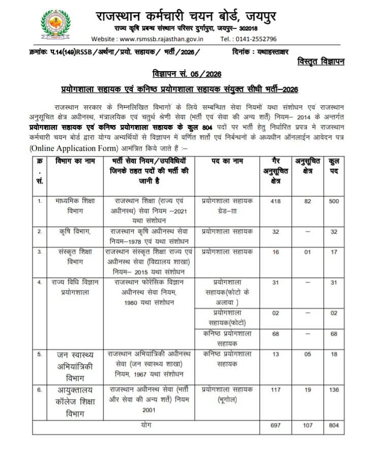 RSSB प्रयोगशाला सहायक एवं कनिष्ठ प्रयोगशाला सहायक (विज्ञान एवं भूगोल) संयुक्त सीधी भर्ती-2026 की विस्तृत विज्ञप्ति जारी
