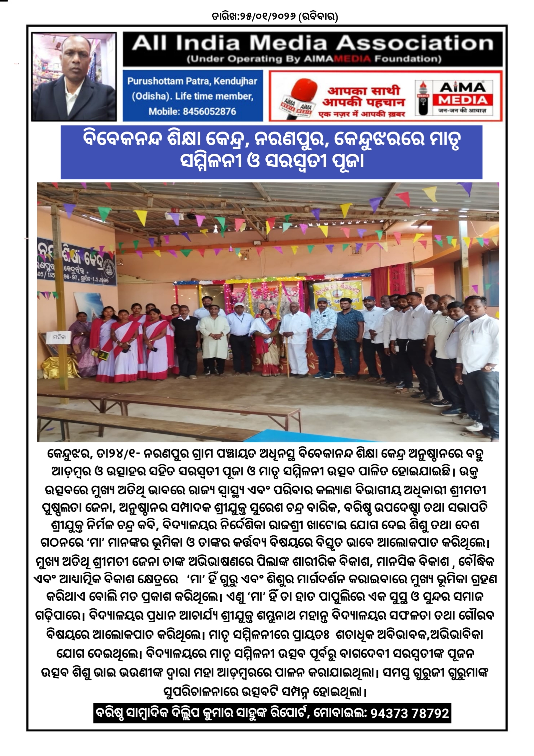 ବିବେକନନ୍ଦ ଶିକ୍ଷା କେନ୍ଦ୍ର, ନରଣପୁର, କେନ୍ଦୁଝରରେ ମାତୃ ସମ୍ମିଳନୀ ଓ ସରସ୍ବତୀ ପୂଜା।