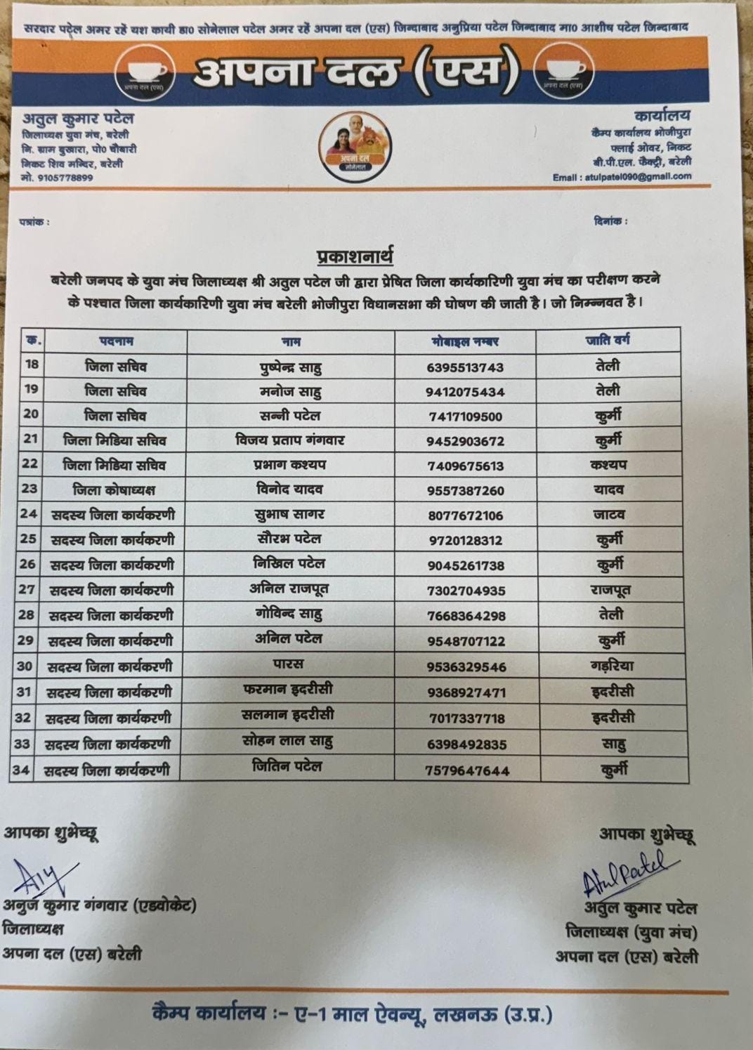 अपना दल (एस) बरेली युवा मंच की नवगठित जिला कार्यकारिणी को हार्दिक बधाई एवं शुभकामनाएँ 💐💐