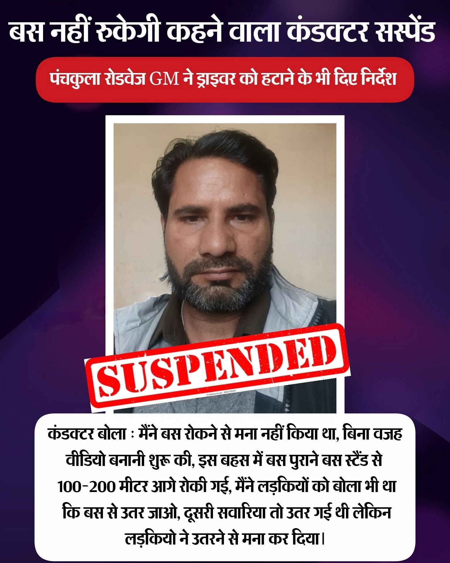 कंडक्टर को पंचकूला रोडवेज जीएम सुखदेव ने सस्पेंड कर दिया है और ड्राइवर को हटाने के भी निर्देश दे दिए है।