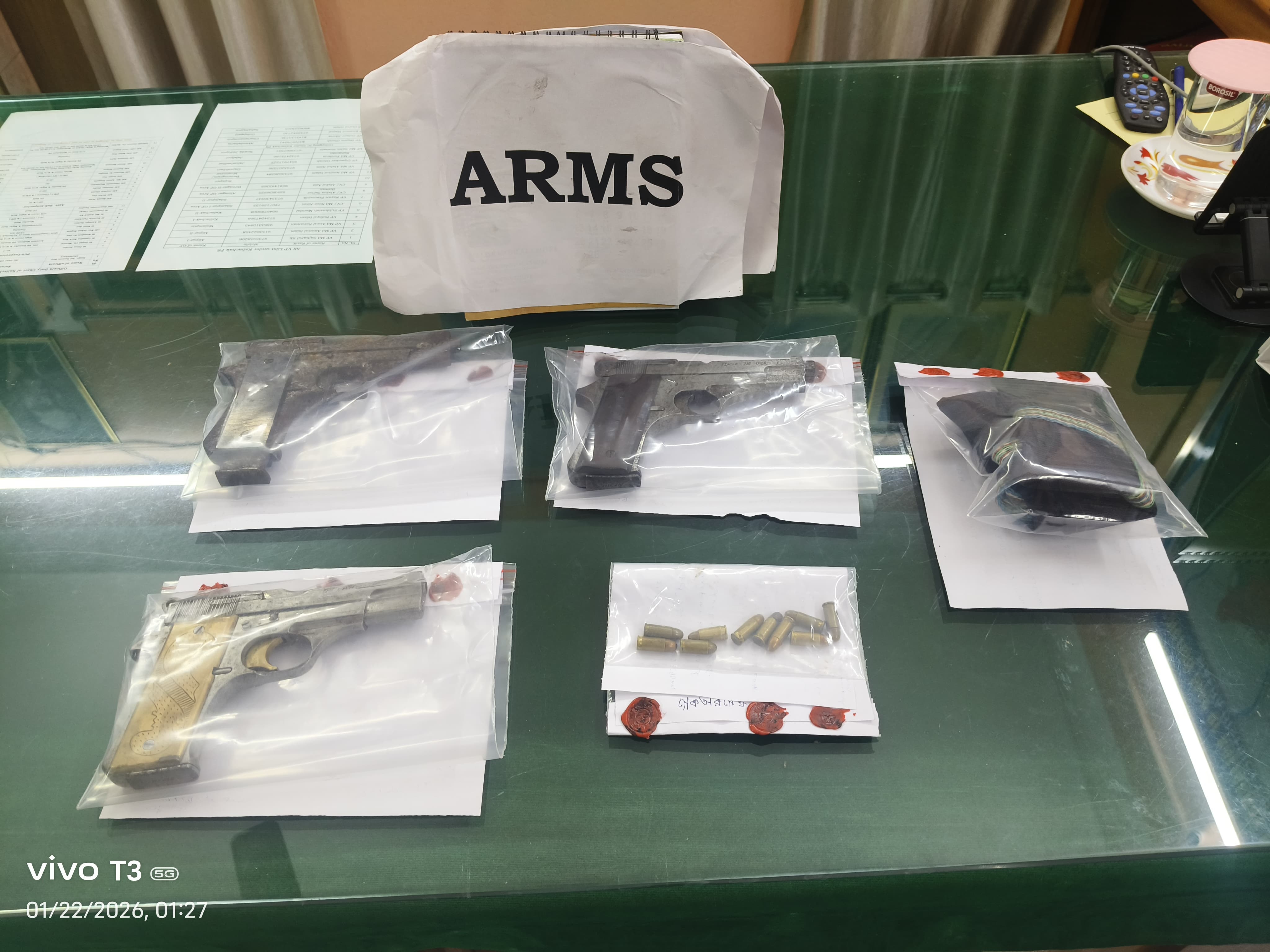 Acting upon a source information on 21st January,2026 in between 22:35 hrs and 23.45 hrs,Police Sub-inspector of Police,Koushik Sarkar of Kaliachak Police Station along with force while performing RT duty at Sultanganj area under Kaliachak Police jurisdiction, detained one Sektar Sk( 27), S/O- Soleman Sk of Khaschadpur, under Kaliachak Police Station,Malda. On searching him, police recovered 3 Nos. of improvised firearms and 10 pieces of live ammunition. On interrogation he admitted his guilt that he didn’t1 possess any valid documents of the fire arms. Over this, Kaliachak Police lodge case vizCase No. 113/26 Date 22.01.2026 U/S- 25(1-B)(a)/35 of Arms Act was started. The accused was taken on remand for further investigation.