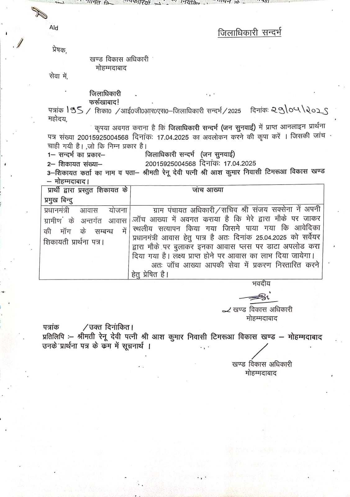 जिला फर्रुखाबाद में ग्राम पंचायत टिमरूआ में रेनू देवी एक बहुत गरीब महिला है जिसने प्रधानमंत्री आवास योजना की मांग जिलाधिकारी महोदय से की थी और जिलाधिकारी महोदय के आदेश के बाद रेनू देवी की प्रधानमंत्री आवास योजना की जांच हुई थी जांच में आवास हेतु पत्र पायी गई थी और सर्वेयर के द्वारा डाटा अपलोड कर दिया गया था लेकिन ग्राम सचिव के द्वारा बार बार रेनू देवी के ऊपर दाव बनाया जा रहा है की तुम अपना लेंटर डालव तुम आवास हेतु अपात्र हो है जब रेनू देवी ने इस मामले की जानकारी को जिला प्रशासन को दी थी और दिनांक 24/01/2026 को ग्राम सचिव संजय सक्सेना हमारे घर पर आये थी और उन्होंने हमें और हमारे पति को बहुत धमकाया है और प्रधानमंत्री आवास योजना की सूची में नाम काटने को कहा कि जब तुम आवास नहीं दिया जायेगा