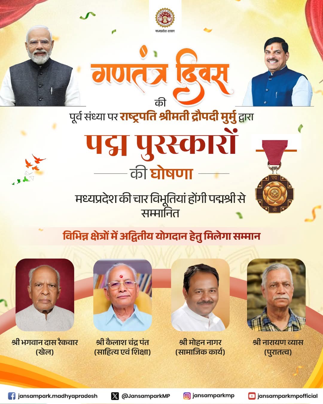 मध्यप्रदेश की चार विभूतियां होंगी पद्मश्री से सम्मानित