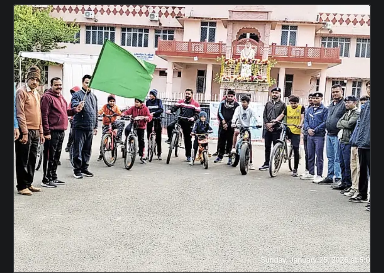 झालावाड़| जिला प्रशासन एवं खेल विभाग माय भारत के तत्वावधान में राष्ट्रीय मतदाता दिवस के उपलक्ष्य में रविवार को साइकिल रैली का आयोजन किया गया। रैली को जिला खेल अधिकारी डॉ. कृपाशंकर शर्मा एवं पार्षद इनाम जफर ने हरी झंडी दिखाकर रवाना किया। कार्यक्रम में स्काउट्स गाइड हरिओम, विनोद खरनीवाल, प्रशांत चतुर्वेदी, उत्कर्ष शर्मा सहित अनेक नागरिक उपस्थित रहे।