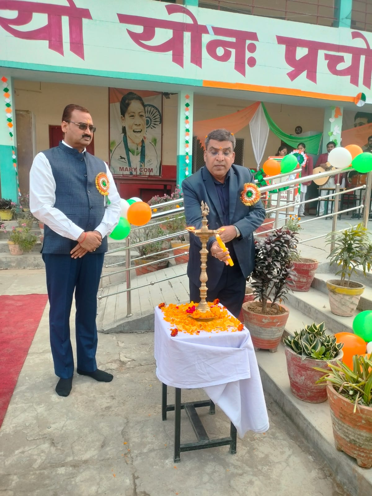 इसके उपरांत विद्यालय के प्राचार्य श्री संजय कुमार पांडेय जी की गरिमामयी उपस्थिति में ध्वजारोहण संपन्न हुआ। विद्यार्थियों ने राष्ट्रध्वज को सलामी दी एवं सामूहिक राष्ट्रगान से वातावरण को गौरवपूर्ण बना दिया।