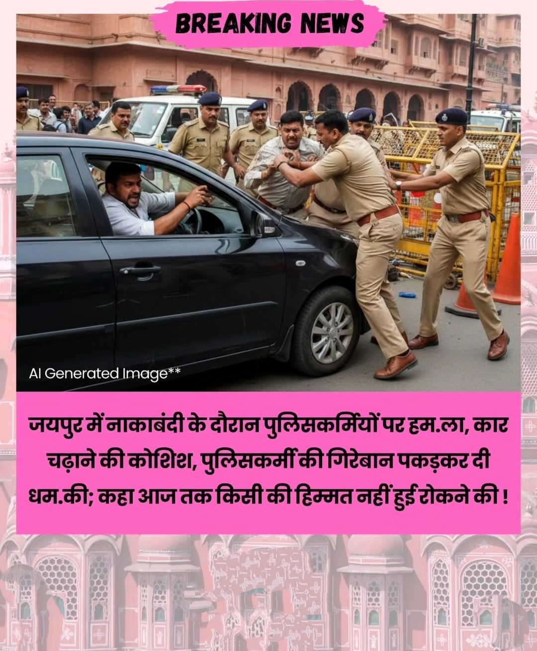 टोंक रोड स्थित इंडिया गेट के पास शुक्रवार रात करीब 11:45 बजे नाकाबंदी के दौरान कार सवार युवकों ने पुलिसकर्मियों पर ह.. मला कर दिया। चैकिंग के लिए रुकने का इशारा करने पर ड्राइवर ने पुलिस पर कार चढ़ाने की कोशिश की और खुद को कार में लॉक कर लिया। कुछ ही देर में उसके साथी मौके पर पहुंचे और पुलिसकर्मियों की गिरेबान पकड़कर मार...पीट व ध..मकी दी।