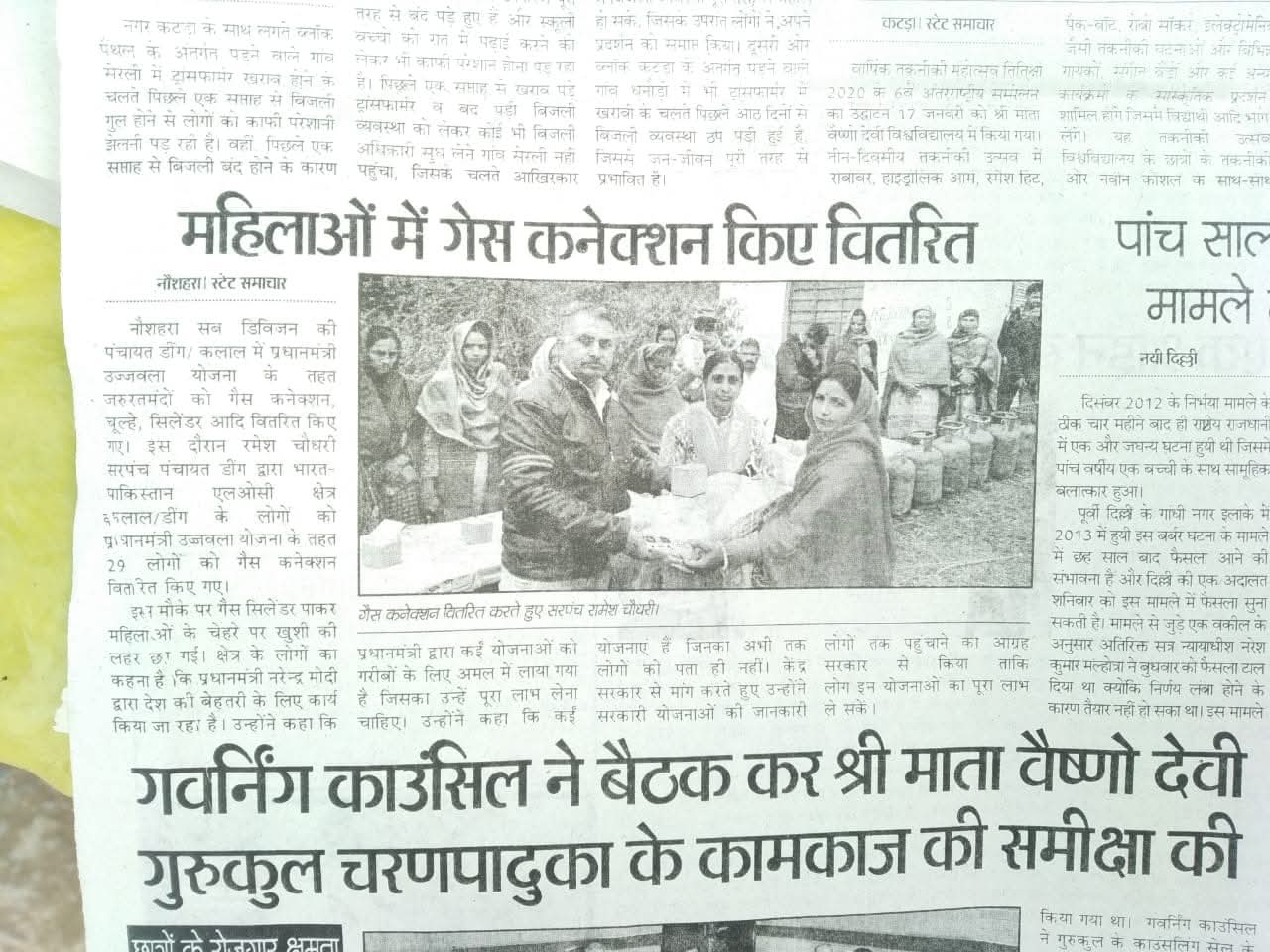 कस्बा नोशहरा की पंचायत डींग कलाल के सरपंच रमेश कुमार चौधरी ने बीपीएल परिवारों गैस चूल्हा के लिए नाम दर्जकर उन्हें निशुल्क गैस कनेक्शन देते हुए गैस सिलेंडर और चूल्हे भेंट किए। इस मौके पर काफी संख्या महिलाओं के साथ अन्य लोग मौजूद थे। सीमावर्ती पंचायत के सरपंच रोमेश कुमार चौधरी ने कहा कि केंद्र सरकार द्वारा चलाई गई उज्जवला योजना के तहत आज निशुल्क गैस कनेक्शन वितरण किए गए।
