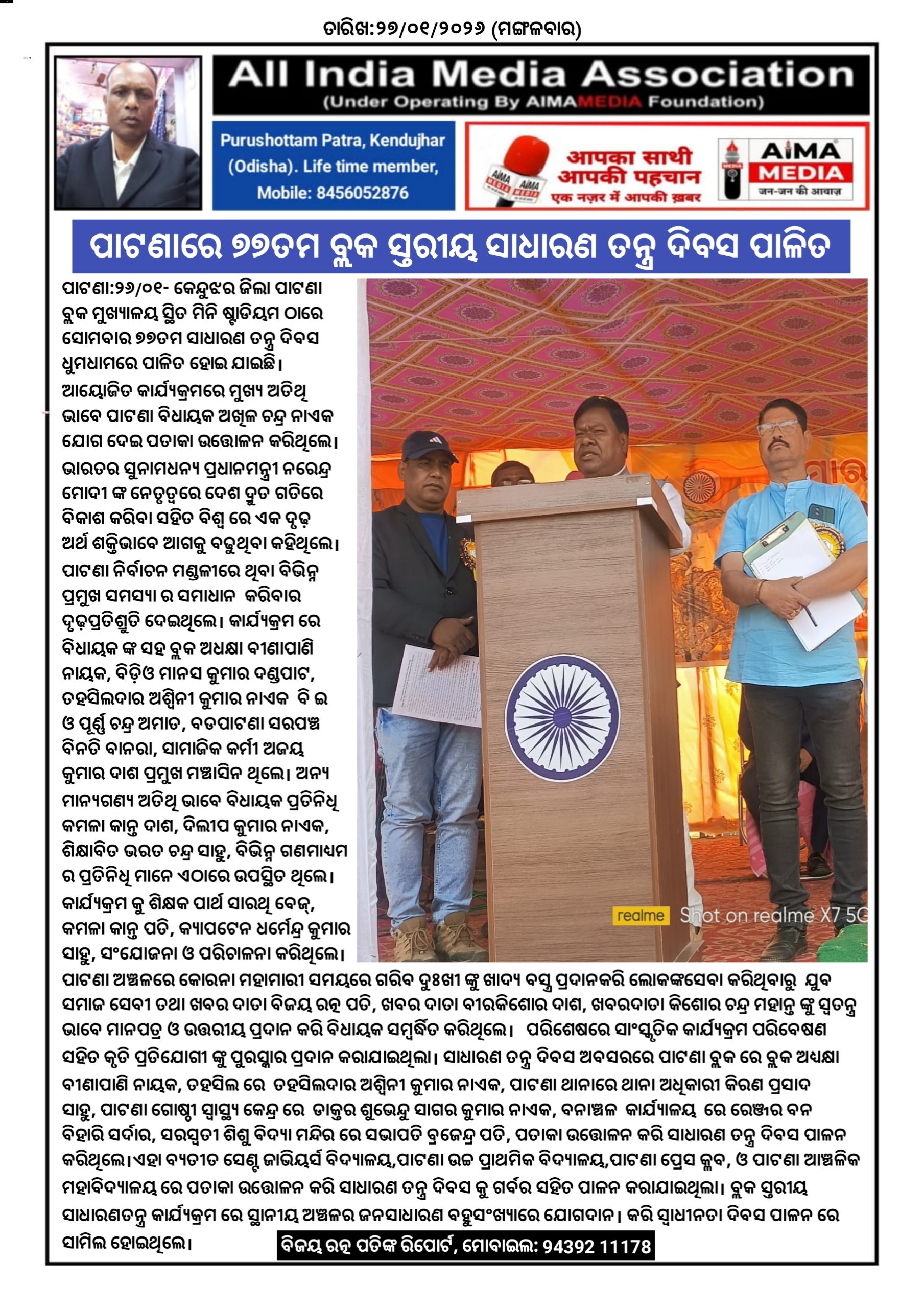 ପାଟଣା:୨୬/୦୧- କେନ୍ଦୁଝର ଜିଲା ପାଟଣା ବ୍ଲକ ମୁଖ୍ୟାଳୟ ସ୍ଥିତ ମିନି ଷ୍ଟାଡିୟମ ଠାରେ ସୋମବାର ୭୭ ତମ ସାଧାରଣ ତନ୍ତ୍ର ଦିବସ ଧୁମଧାମରେ ପାଳିତ ହୋଇ ଯାଇଛି। ଆୟୋଜିତ କାର୍ଯ୍ୟକ୍ରମରେ ମୁଖ୍ୟ ଅତିଥି ଭାବେ ପାଟଣା ବିଧାୟକ ଅଖିଳ ଚନ୍ଦ୍ର ନାଏକ ଯୋଗ ଦେଇ ପତାକା ଉତ୍ତୋଳନ କରିଥିଲେ। ଭାରତର ସୁନାମଧନ୍ୟ ପ୍ରଧାନମନ୍ତ୍ରୀ ନରେନ୍ଦ୍ର ମୋଦୀ ଙ୍କ ନେତୃତ୍ଵରେ ଦେଶ ଦ୍ରୁତ ଗତିରେ ବିକାଶ କରିବା ସହିତ ବିଶ୍ଵ ରେ ଏକ ଦୃଢ଼ ଅର୍ଥ ଶକ୍ତିଭାବେ ଆଗକୁ ବଢୁଥିବା କହିଥିଲେ। ପାଟଣା ନିର୍ବାଚନ ମଣ୍ଡଳୀରେ ଥିବା ବିଭିନ୍ନ ପ୍ରମୁଖ ସମସ୍ୟା ର ସମାଧାନ କରିବାର ଦୃଢ଼ପ୍ରତିଶ୍ରୁତି ଦେଇଥିଲେ। କାର୍ଯ୍ୟକ୍ରମ ରେ ବିଧାୟକ ଙ୍କ ସହ ବ୍ଲକ ଅଧକ୍ଷା ବୀଣାପାଣି ନାୟକ, ବିଡ଼ିଓ ମାନସ କୁମାର ଦଣ୍ଡପାଟ, ତହସିଲଦାର ଅଶ୍ୱିନୀ କୁମାର ନାଏକ ବି ଇ ଓ ପୂର୍ଣ୍ଣ ଚନ୍ଦ୍ର ଅମାତ, ବଡପାଟଣା ସରପଞ୍ଚ ବିନତି ବାନରା, ସାମାଜିକ କର୍ମୀ ଅଜୟ କୁମାର ଦାଶ ପ୍ରମୁଖ ମଞ୍ଚାସିନ ଥିଲେ। ଅନ୍ୟ ମାନ୍ୟଗଣ୍ୟ ଅତିଥି ଭାବେ ବିଧାୟକ ପ୍ରତିନିଧି କମଳା କାନ୍ତ ଦାଶ, ଦିଲୀପ କୁମାର ନାଏକ, ଶିକ୍ଷାବିତ ଭରତ ଚନ୍ଦ୍ର ସାହୁ,ବିଭିନ୍ନ ଗଣମାଧ୍ୟମ ର ପ୍ରତିନିଧି ମାନେ ଏଠାରେ ଉପସ୍ଥିତ ଥିଲେ। କାର୍ଯ୍ୟ କ୍ରମ କୁ ଶିକ୍ଷକ ପାର୍ଥ ସାରଥି ବେଜ୍, କମଳା କାନ୍ତ ପତି, କ୍ୟାପଟେନ ଧର୍ମେନ୍ଦ୍ର କୁମାର ସାହୁ, ସଂଯୋଜନା ଓ ପରିଚାଳନା କରିଥିଲେ।ପାଟଣା ଅଞ୍ଚଳରେ କୋରନା ମହାମାରୀ ସମୟରେ ଗରିବ ଦୁଃଖୀ ଙ୍କୁ ଖାଦ୍ୟ ବସ୍ତ୍ର ପ୍ରଦାନକରି ଲୋକଙ୍କସେବା କରିଥିବାରୁ ଯୁବ ସମାଜ ସେବୀ ତଥା ଖବର ଦାତା ବିଜୟ ରତ୍ନ ପତି, ଖବର ଦାତା ବୀରକିଶୋର ଦାଶ, ଖବରଦାତା କିଶୋର ଚନ୍ଦ୍ର ମହାନ୍ତ ଙ୍କୁ ସ୍ୱତନ୍ତ୍ର ଭାବେ ମାନପତ୍ର ଓ ଉତ୍ତରୀୟ ପ୍ରଦାନ କରି ବିଧାୟକ ସମ୍ବର୍ଦ୍ଧିତ କରିଥିଲେ। ପରିଶେଷରେ ସାଂସ୍କୃତିକ କାର୍ଯ୍ୟକ୍ରମ ପରିବେଷଣ ସହିତ କୃତି ପ୍ରତିଯୋଗୀ ଙ୍କୁ ପୁରସ୍କାର ପ୍ରଦାନ କରାଯାଇଥିଲା। ସାଧାରଣ ତନ୍ତ୍ର ଦିବସ ଅବସରରେ ପାଟଣା ବ୍ଲକ ରେ ବ୍ଲକ ଅଧ୍ୟକ୍ଷା ବୀଣାପାଣି ନାୟକ, ତହସିଲ ରେ ତହସିଲଦାର ଅଶ୍ୱିନୀ କୁମାର ନାଏକ, ପାଟଣା ଥାନାରେ ଥାନା ଅଧିକାରୀ କିରଣ ପ୍ରସାଦ ସାହୁ, ପାଟଣା ଗୋଷ୍ଠୀ ସ୍ୱାସ୍ଥ୍ୟ କେନ୍ଦ୍ର ରେ ଡାକ୍ତର ଶୁଭେନ୍ଦୁ ସାଗର କୁମାର ନାଏକ, ବନାଞ୍ଚଳ କାର୍ଯ୍ୟାଳୟ ରେ ରେଞ୍ଜର ବନ ବିହାରି ସର୍ଦାର, ସରସ୍ୱତୀ ଶିଶୁ ଵିଦ୍ୟା ମନ୍ଦିର ରେ ସଭାପତି ବ୍ରଜେନ୍ଦ୍ର ପତି, ପତାକା ଉତ୍ତୋଳନ କରି ସାଧାରଣ ତନ୍ତ୍ର ଦିବସ ପାଳନ କରିଥିଲେ। ଏହା ବ୍ୟତୀତ ସେଣ୍ଟ ଜାଭିୟର୍ସ ବିଦ୍ୟାଳୟ,ପାଟଣା ଉଚ୍ଚ ପ୍ରାଥମିକ ବିଦ୍ୟାଳୟ, ପାଟଣା ପ୍ରେସ କ୍ଳବ ଓ ପାଟଣା ଆଞ୍ଚଳିକ ମହାବିଦ୍ୟାଳୟ ରେ ପତାକା ଉତ୍ତୋଳନ କରି ସାଧାରଣ ତନ୍ତ୍ର ଦିବସ କୁ ଗର୍ବର ସହିତ ପାଳନ କରାଯାଇଥିଲା। ବ୍ଲକ ସ୍ତରୀୟ ସାଧାରଣତନ୍ତ୍ର କାର୍ଯ୍ୟକ୍ରମ ରେ ସ୍ଥାନୀୟ ଅଞ୍ଚଳର ଜନସାଧାରଣ ବହୁସଂଖ୍ୟାରେ ଯୋଗଦାନ। କରି ସ୍ୱାଧୀନତା ଦିବସ ପାଳନ ରେ ସାମିଲ ହୋଇଥିଲେ।