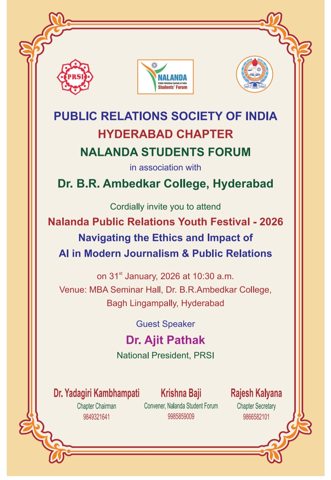 The Public Relations Society of India (PRSI), Hyderabad Chapter, in collaboration with the Nalanda Students Forum and Dr. B.R. Ambedkar College, Hyderabad, is set to organize the Nalanda Public Relations Youth Festival 2026 on Saturday 31 January 2026. The event will be held at 10:30 a.m. at the MBA Seminar Hall, Dr. B.R. Ambedkar College, Bagh Lingampally, Hyderabad.