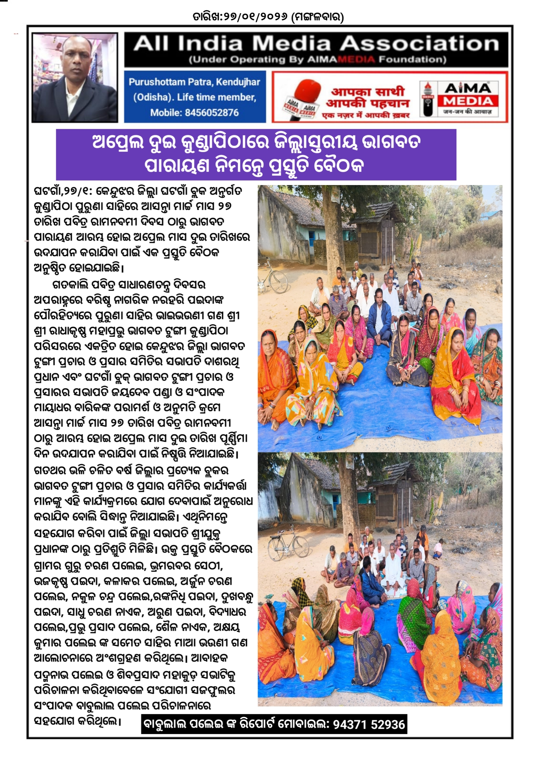 ଘଟଗାଁ,୨୭/୧ : କେନ୍ଦୁଝର ଜିଲ୍ଲା ଘଟଗାଁ ବ୍ଲକ ଅନ୍ତର୍ଗତ କୁଣ୍ଡାପିଠା ପୁରୁଣା ସାହିରେ ଆସନ୍ତା ମାର୍ଚ୍ଚ ମାସ ୨୭ ତାରିଖ ପବିତ୍ର ରାମନବମୀ ଦିବସ ଠାରୁ ଭାଗବତ ପାରାୟଣ ଆରମ୍ଭ ହୋଇ ଅପ୍ରେଲ ମାସ ଦୁଇ ତାରିଖରେ ଉଦଯାପନ କରାଯିବା ପାଇଁ ଏକ ପ୍ରସ୍ତୁତି ବୈଠକ ଅନୁଷ୍ଠିତ ହୋଇଯାଇଛି ।