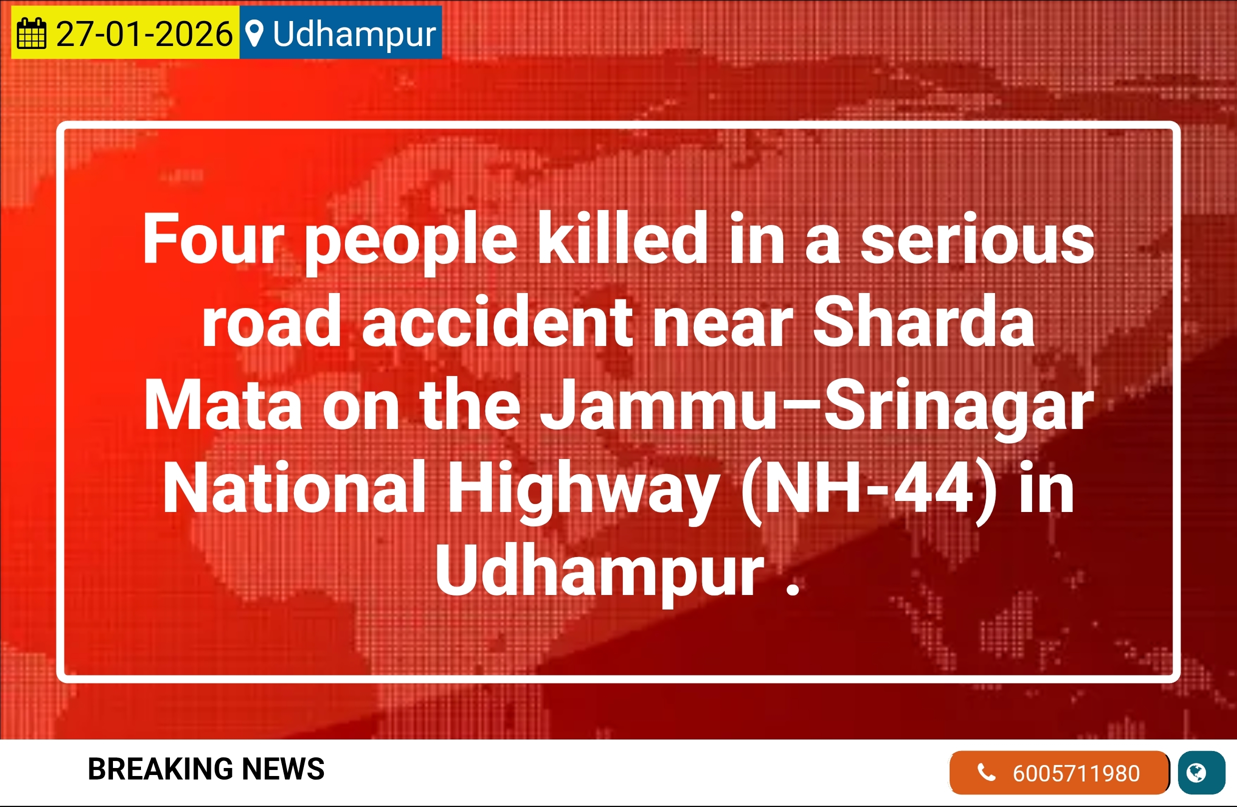 Four people killed in a serious road accident near Sharda Mata on the Jammu–Srinagar National Highway (NH-44) in Udhampur .