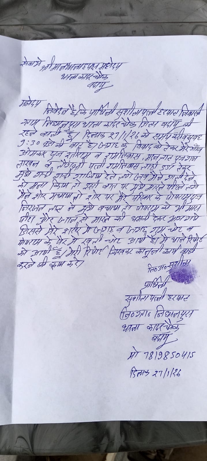 मारपीट करने की महिला सुशीला आशा ने थाने में की शिकायत ।