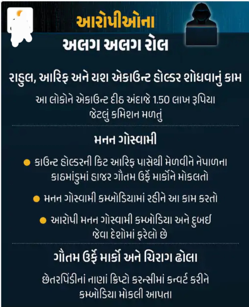 એકાઉન્ટ હોલ્ડર શોધવાનું કામ રાહુલ, આરિફ અને યશનું હતું. આવા એકાઉન્ટ હોલ્ડર શોધવા માટે તેમને એકાઉન્ટ દીઠ અંદાજે 1.50 લાખ રૂપિયા જેટલું કમિશન મળતું હતું.