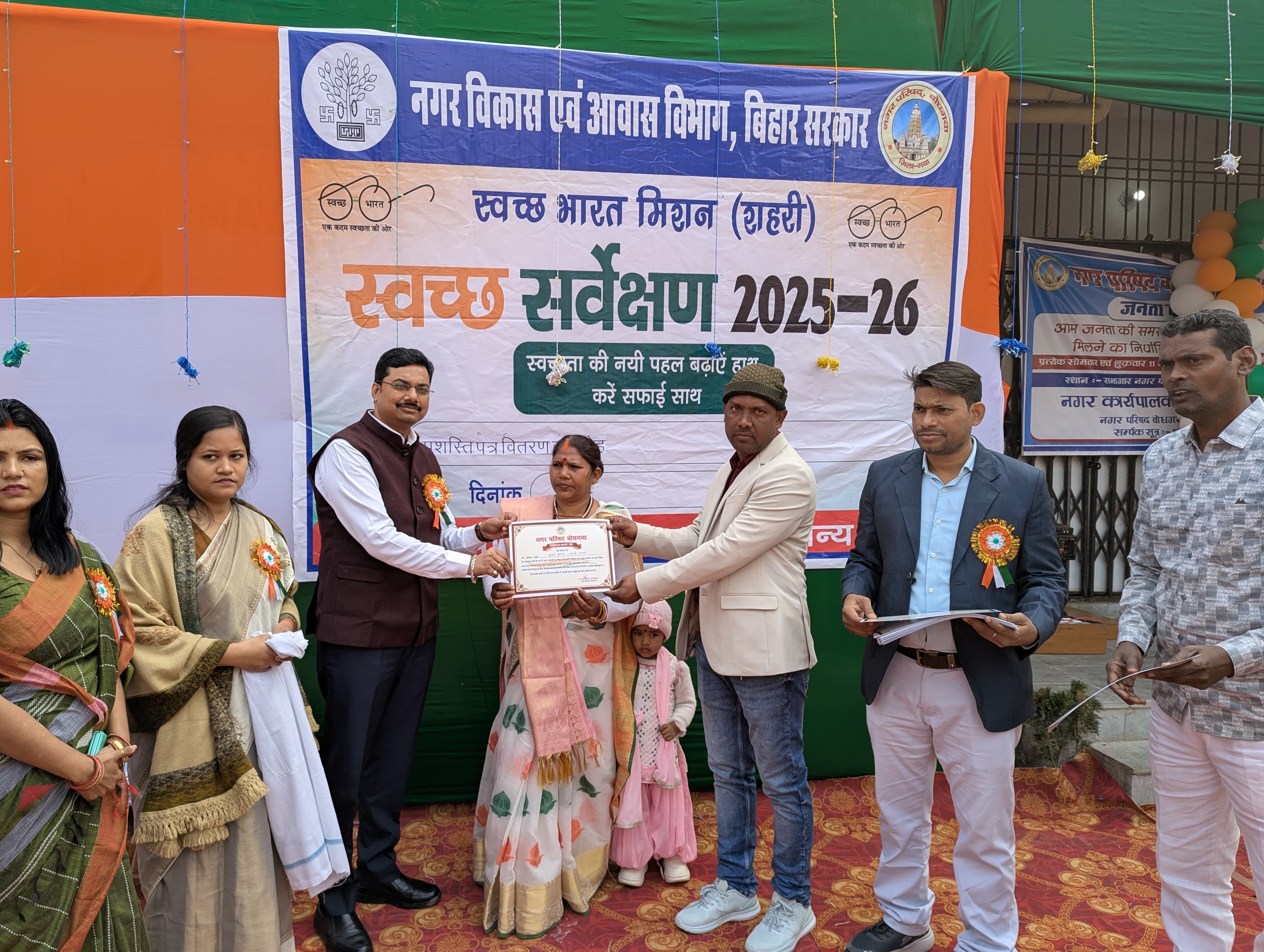 बोधगया नगर परिषद कार्यालय में गणतंत्र दिवस के अवसर पर सोमवार को स्वच्छता के क्षेत्र में उत्कृष्ट कार्य करने वाले 50 सफाईदूतों को सम्मानित किया गया। जिसमें सफाई प्रभारी, सफाईकर्मी, सुपरवाइजर व चालक शामिल हैं। नगर परिषद की ओर से आयोजित सम्मान समारोह में सभापति ललिता देवी और कार्यपालक पदाधिकारी राजीव कुमार गुप्ता ने संयुक्त रूप से सभी सफाईदूतों को उत्कृष्टता प्रमाण पत्र प्रदान कर उनका हौसला बढ़ाया। इस मौके पर सभापति ललिता देवी ने कहा कि शहर की साफ-सफाई बनाए रखने में सफाईदूतों की भूमिका सबसे अहम है। पितृपक्ष मेला, छठ पूजा, बौद्ध महोत्सव जैसे बड़े आयोजनों के साथ-साथ बोधगया में आने वाले विशिष्ट और अति विशिष्ट अतिथियों के दौरान शहर की स्वच्छ छवि इन्हीं सफाईदूतों के परिश्रम का परिणाम है। उन्होंने कहा कि नगर परिषद इन कर्मठ कर्मचारियों के योगदान को हमेशा सम्मान के साथ देखती है। कार्यपालक पदाधिकारी राजीव कुमार गुप्ता ने बताया कि प्रशस्ति पत्र के माध्यम से सफाईदूतों को सम्मानित कर उनका मनोबल बढ़ाने का प्रयास किया गया है। उन्होंने सभी कर्मचारियों से शहर को स्वच्छ और सुंदर बनाए रखने के लिए निरंतर प्रयास करने की अपील की। कार्यक्रम में नगर प्रबंधक प्रियरंजन, प्रधान सहायक कुंदन कुमार, सफाई प्रभारी मुन्ना कुमार, पप्पू कुमार, विनय कुमार सहित नगर परिषद के अन्य कर्मी उपस्थित थे।