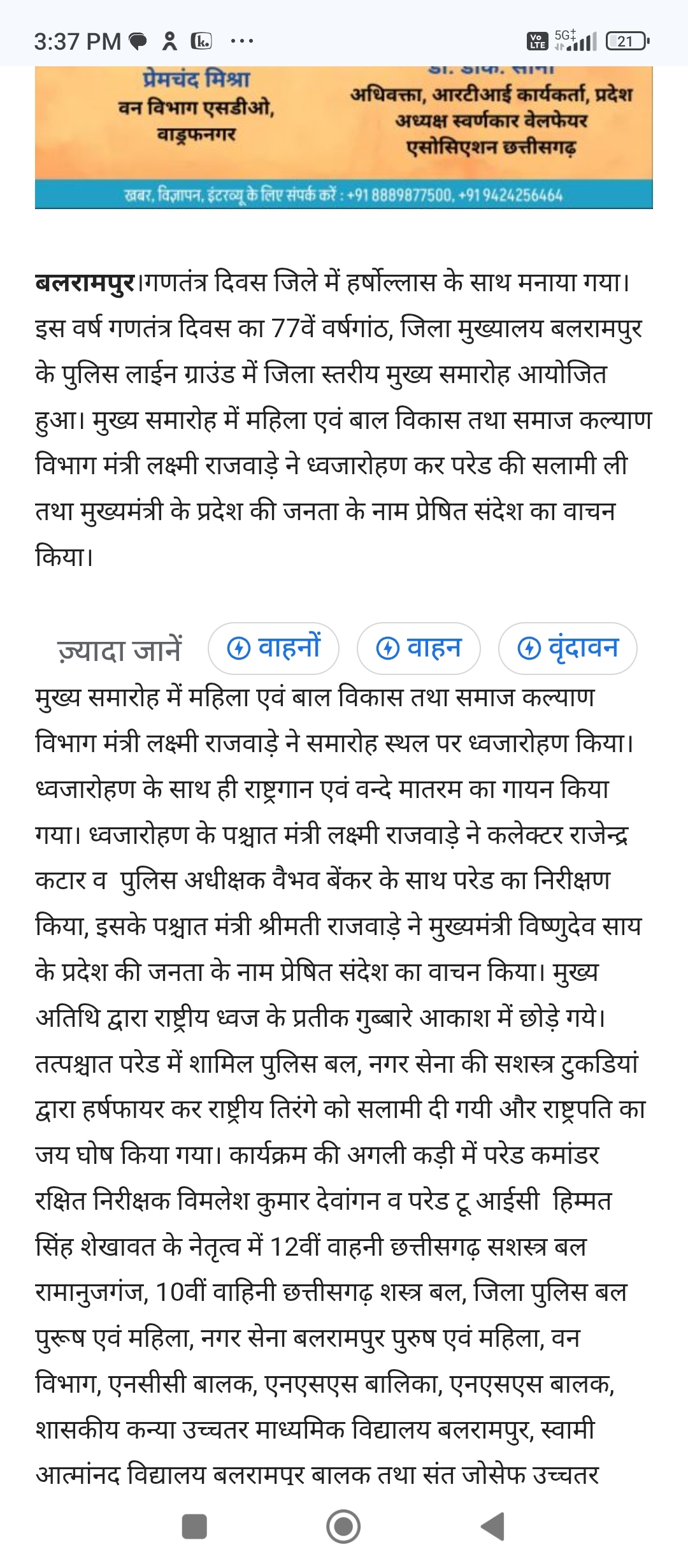 बलरामपुर:।बलरामपुर में हर्षोल्लास के साथ 77 वें गणतंत्र दिवस मनाया गया, मुख्य समारोह में मंत्री लक्ष्मी राजवाड़े ध्वजारोहण कर की परेड की सलामी।