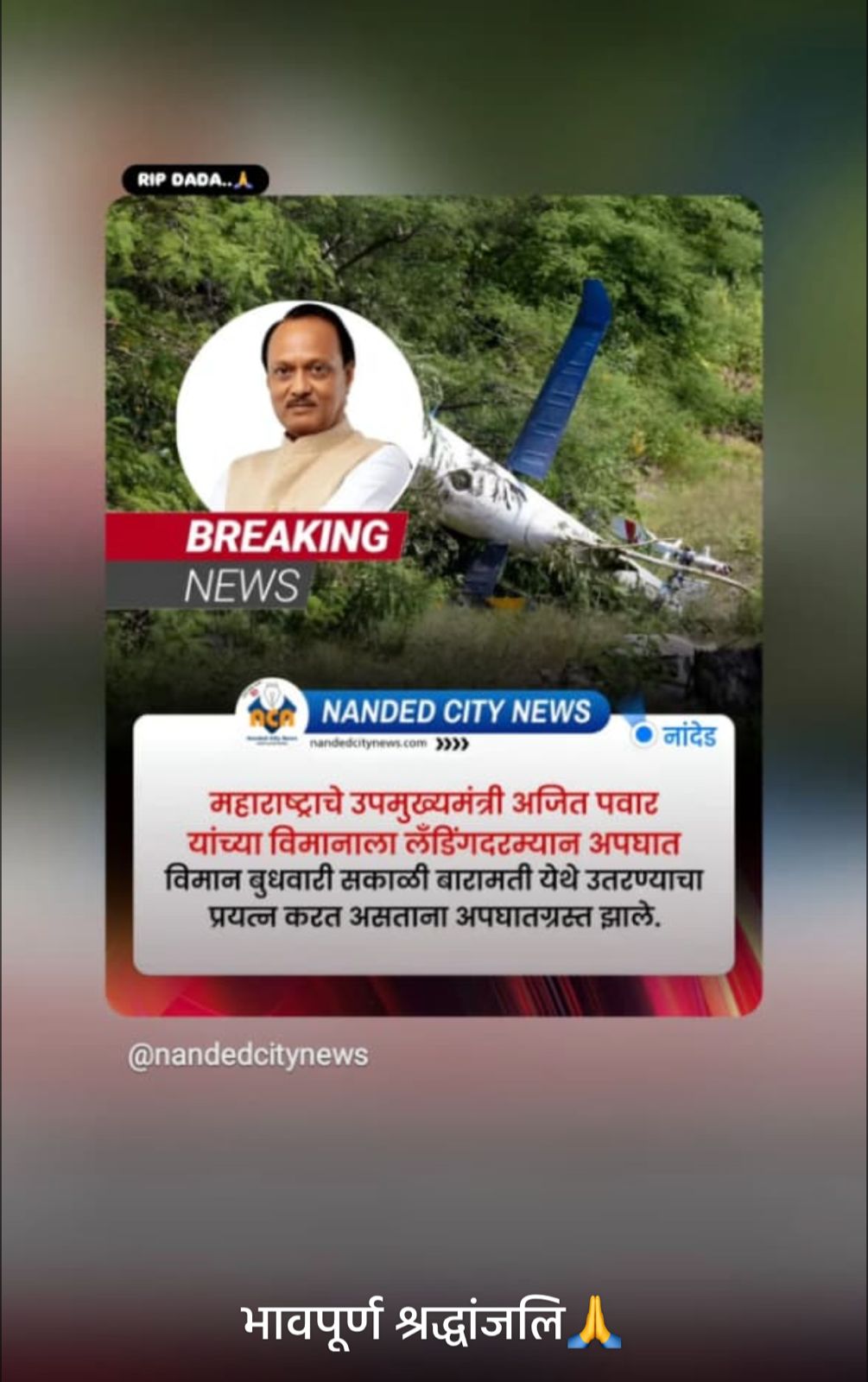 आज सुबह विमान क्रेश में महाराष्ट्र के उप मुख्यमंत्री अजीत दादा पवार का निधन