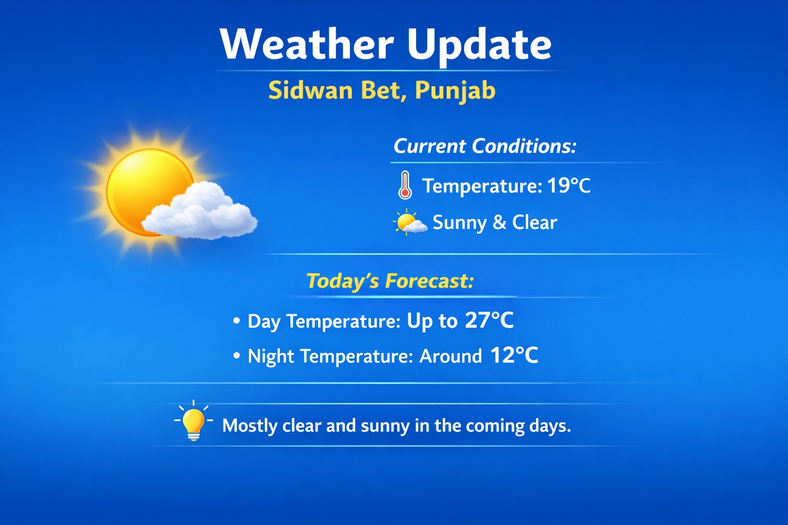 ਸਿੱਧਵਾਂ ਬੇਟ (ਪੰਜਾਬ, ਭਾਰਤ) — ਅੱਜ ਦਾ ਮੌਸਮ: 🌤️ 📍 ਅੱਜ ਦਾ ਤਾਜ਼ਾ ਹਾਲ