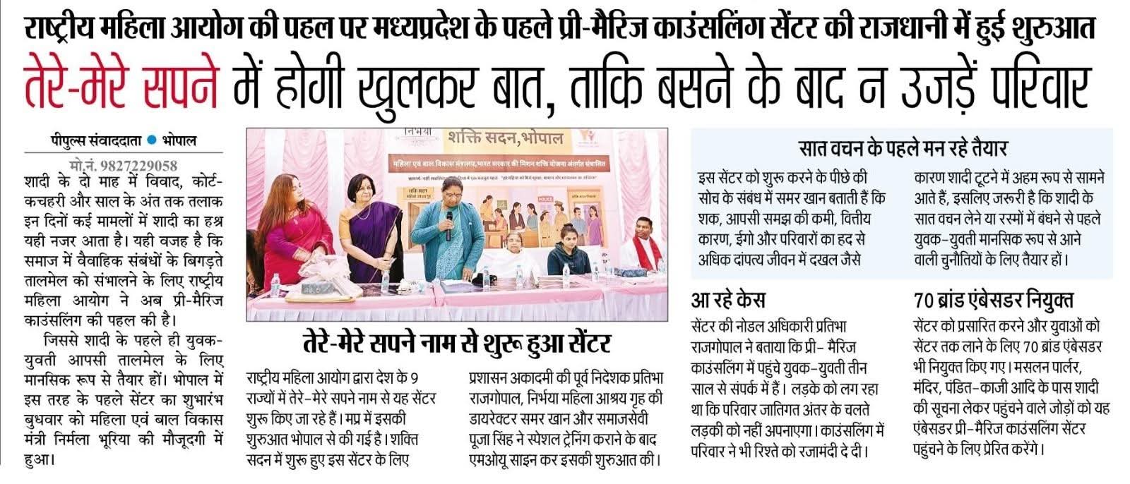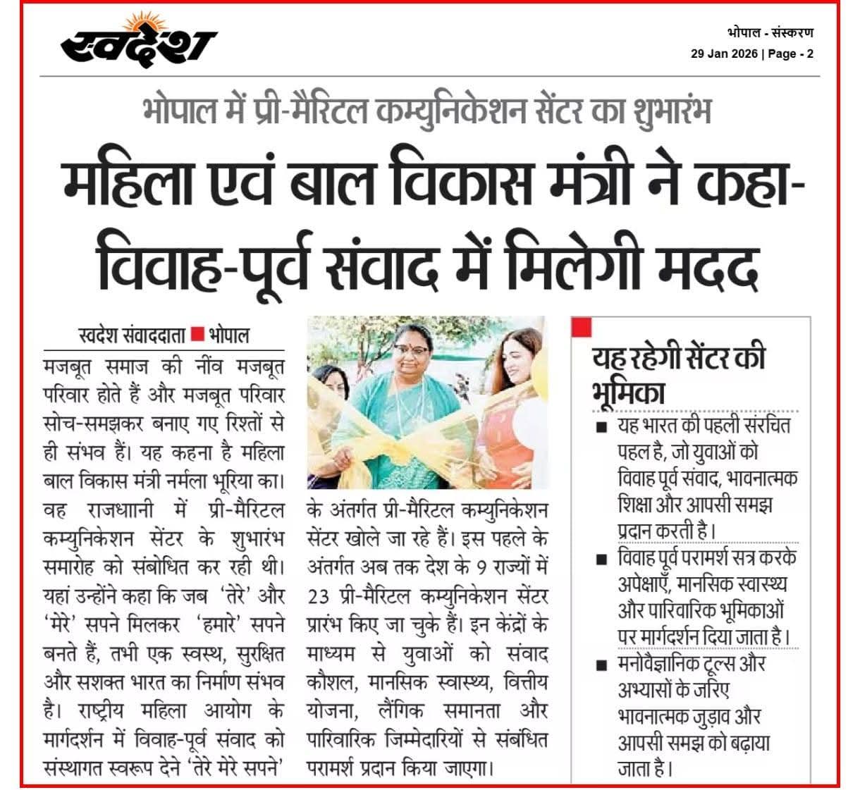 राष्ट्रीय महिला आयोग की पहल पर भोपाल में मध्यप्रदेश के पहले प्री मैरिटल कम्युनिकेशन सेंटर (PMCC) तेरे मेरे सपने का शुभारंभ