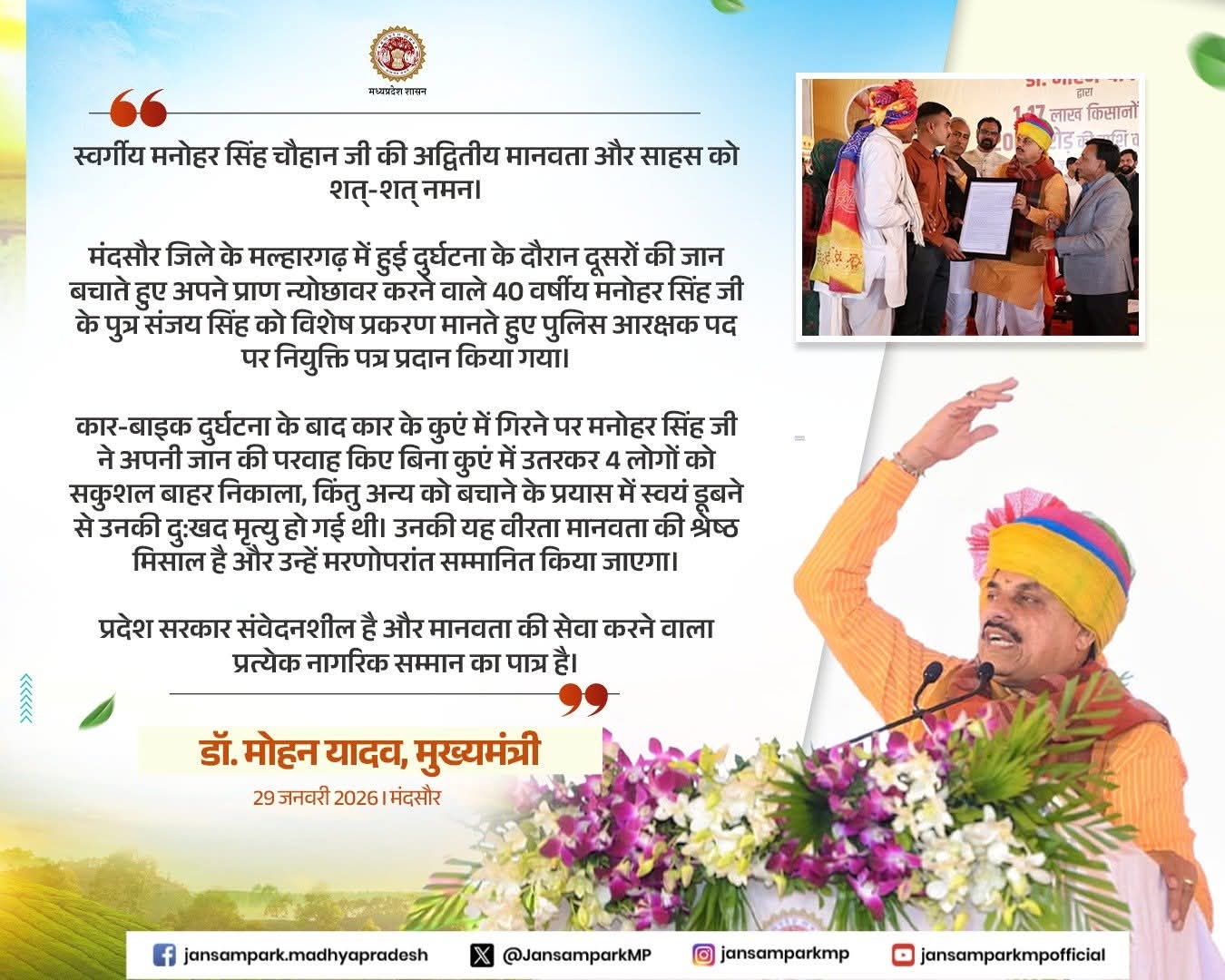 मंदसौर जिले के मल्हारगढ़ में हुई दुर्घटना के दौरान दूसरों की जान बचाते हुए अपने प्राण न्योछावर करने वाले 40 वर्षीय मनोहर सिंह जी के पुत्र संजय सिंह को विशेष प्रकरण मानते हुए पुलिस आरक्षक पद पर नियुक्ति पत्र प्रदान किया गया।