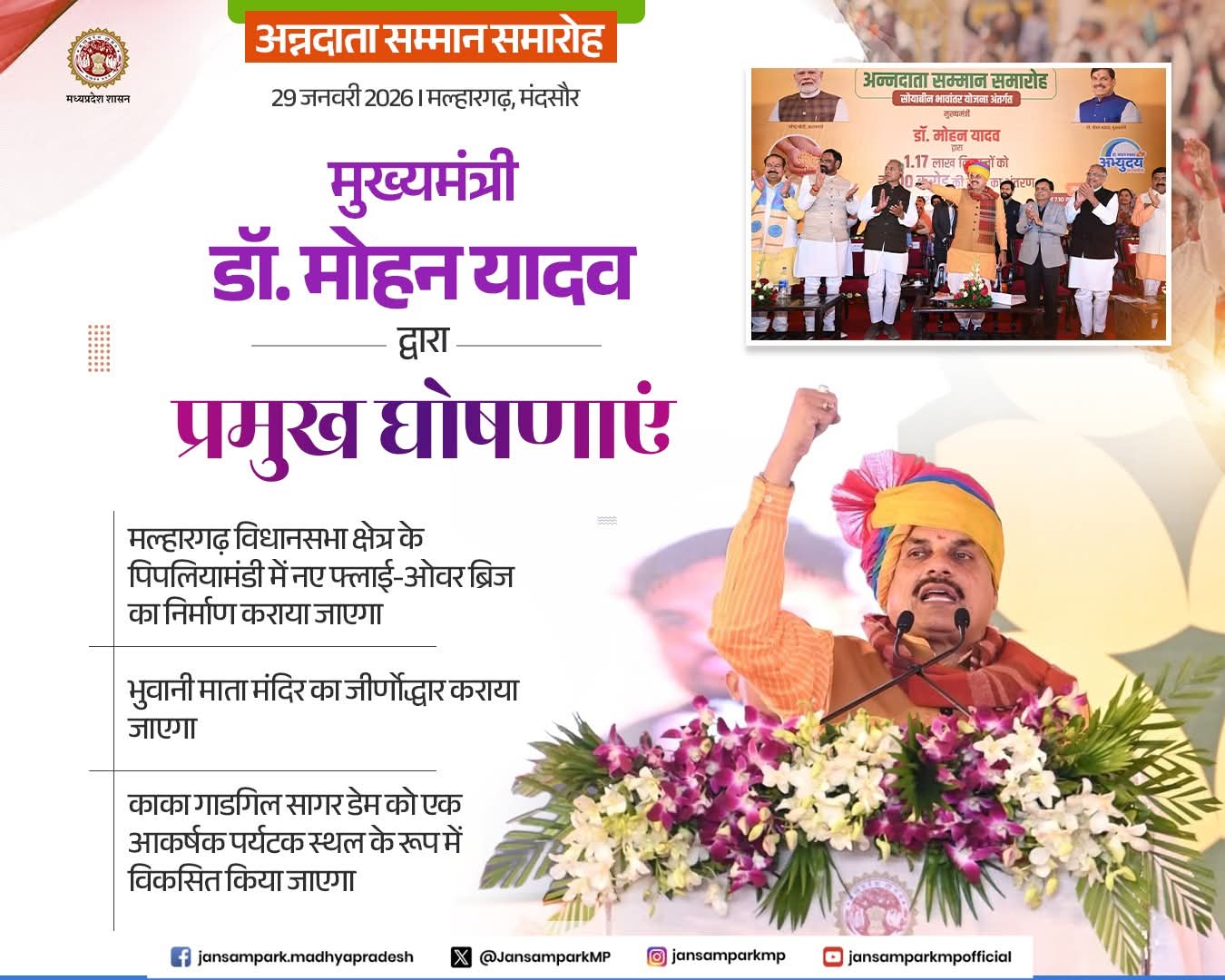 मुख्यमंत्री डॉ. मोहन यादव द्वारा मंदसौर जिले के मल्हारगढ़ में आयोजित अन्नदाता सम्मान समारोह में महत्वपूर्ण घोषणाएं